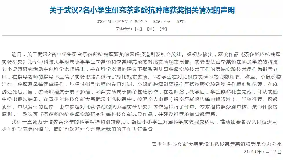 消息,表示小学生研究抗肿瘤获奖一事,系独立完成,认可其成果作品。