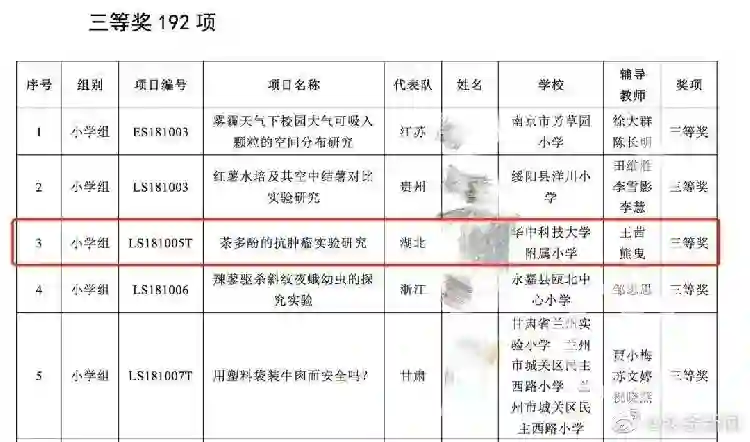 而第33界全国青少年科技创新大赛中另一个项目同样引起了公众关注,武汉两名小学生凭借《茶多酚的抗肿瘤实验研究》项目获得小学组三等奖。