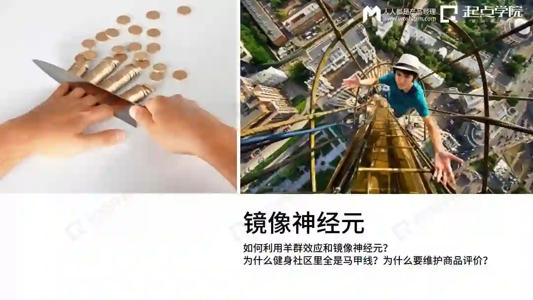 大家看这两张图,你可能会有“好疼”和恐高的感受,这就是镜像神经元在起作用。