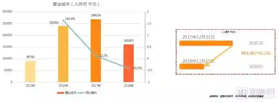 2.2018年,在营业收入同比增长4.2%的情况下,营业成本实现负增长, 大幅减少40.2%。在收入增长的情况下,运营成大幅降低,能够直接说明企业的管理能力及运营效率得到了大幅提升。