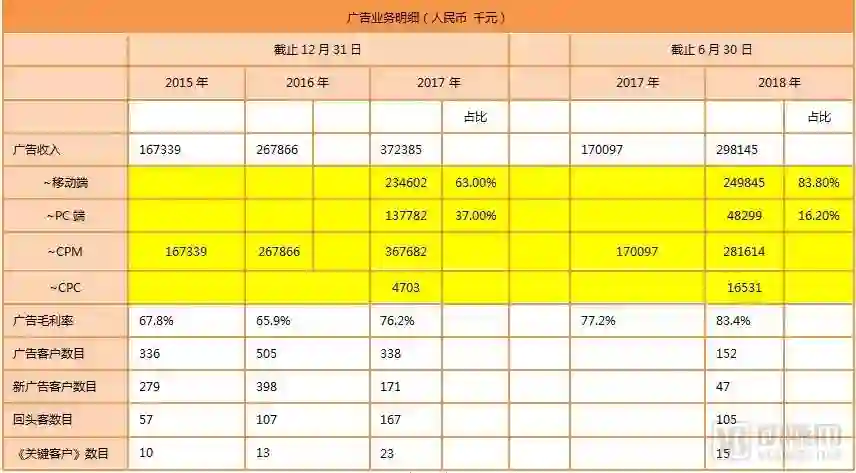 关键客户数据:从2015年到2016年,关键客户数目由10名增长至13名;2017年到2018年,关键广告客户数目进一步增长至23名;到了2018年上半年,关键广告客户数达到了15名,预计2018年全年的关键广告客户数将超过2017年。