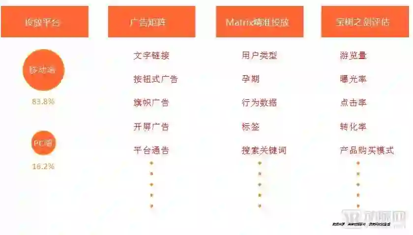 从广告形式出发,宝宝树为广告客户提供包含文字、图片、推送、矩阵等多种多样的广告形式,同时也能为客户提供一整套的广告解决方案。整个的广告业务建立在基于大数据的系统Matrix之上,通过考量目标客户特征分析、行为偏好等多种因素为广告客户提供精准广告服务。