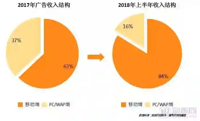 2017年全年的广告收入由37%的PC/WAP端收入及63%的移动端构成;而到了2018年上半年,其广告收入则由16%的PC/WAP端收入及84%的移动端收入构成。