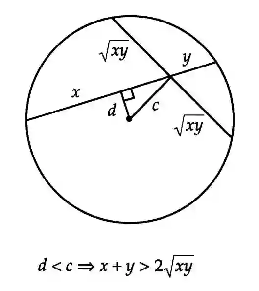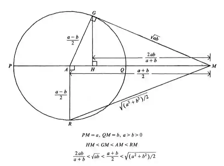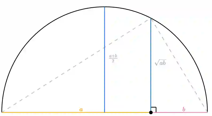 上图中的半圆直径长度为 a+b,所以半径的长度为 (a+b)/2,也就是 a 和 b 这两个数的算术平均值。利用射影定理,只要沿着 a 线段与 b 线段的交点做一条垂线,我们就能得到几何平均。