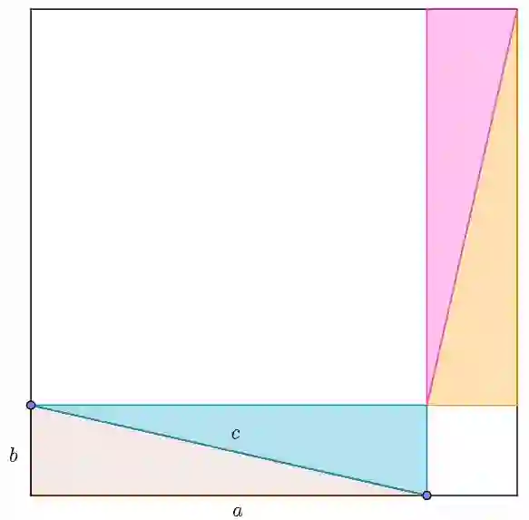 原本位于大正方形两个角落的小正方形的面积分别为 a 的平方和 b 的平方。通过平移三角形,我们发现空白部分的面积正好为 c 的平方,也就是勾股定理。