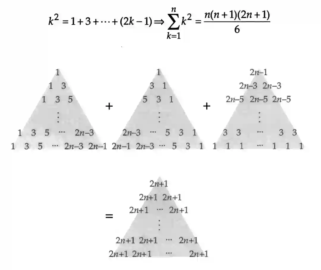 我们已经知道了,一个数的平方和可以拆解成一串奇数的和。那么,在上图第一个三角形中,每一行都对应着一个平方和。把这个三角形旋转到各个方向上再求和,我们就能够得到一个每个格点上均为 2n+1 的三角形。而 2n+1 的个数是很好数的,正好为 1 + 2 + … + n = n(n+1)/2 。再考虑到我们把平方和计算了 3 遍,我们最终就能够得到平方和的求和公式。