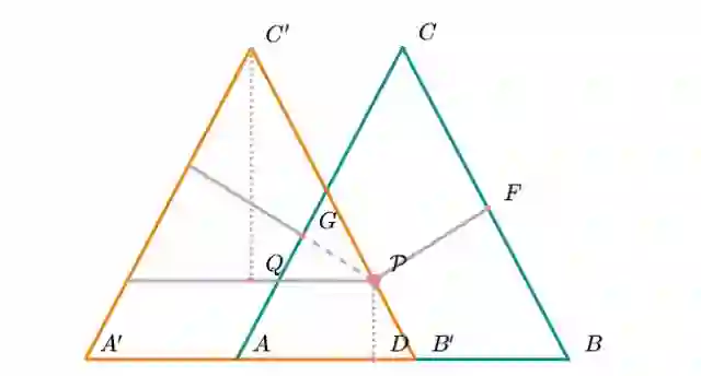利用正三角形各个边上的高相等,我们可以通过旋转和平移把这三条线段「拼」在一起。