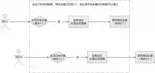 在上面的这个图中,就导致了并发用户 B 也“抢购成功”,多让一个人获得了商品。这种场景,在高并发的情况下非常容易出现。