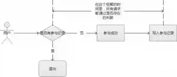 例如一个简单的领取逻辑,先判断用户是否有参与记录,如果没有则领取成功,最后写入到参与记录中。