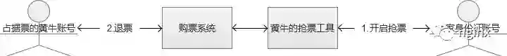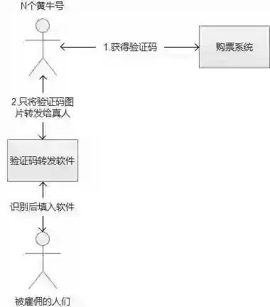 高级的黄牛刷票时,在识别验证码的时候使用真实的人,中间搭建一个展示验证码图片的中转软件服务,真人浏览图片并填写下真实验证码,返回给中转软件。