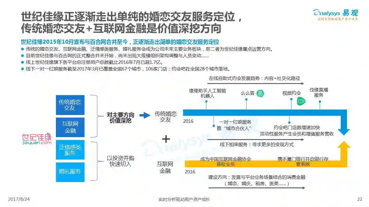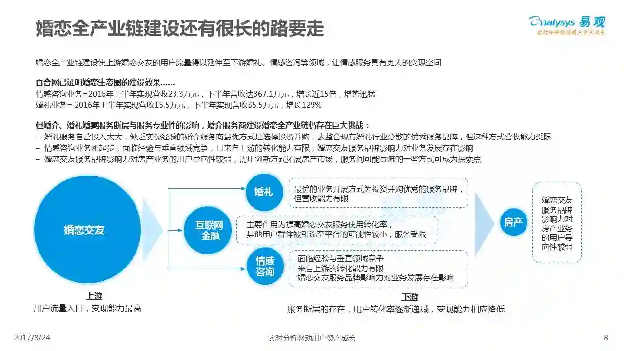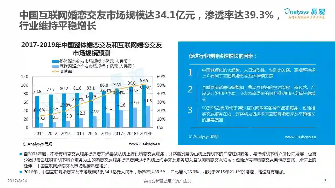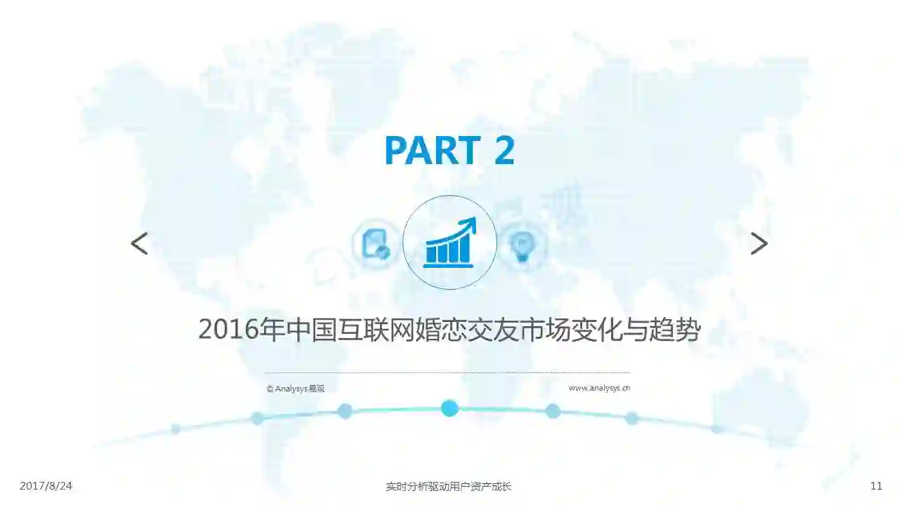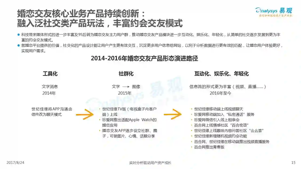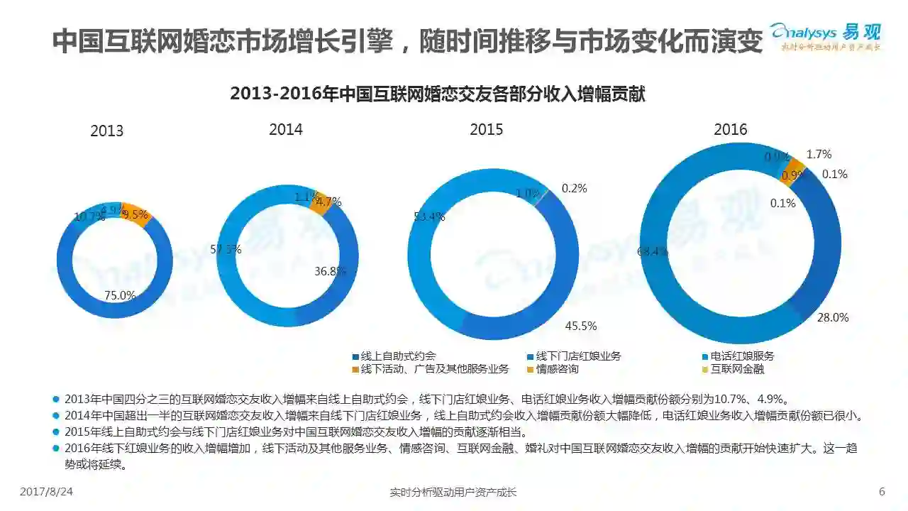 中国互联网婚恋市场增长引擎,随时间推移与市场变化而演变,情感匹配依然为互联网婚恋交友的核心与主要营收来源,婚恋全产业链建设还有很长的路要走。易观为您带来《2017中国互联网婚恋交友服务年度分析》,愿连理枝花繁叶茂,比翼鸟长长久久。