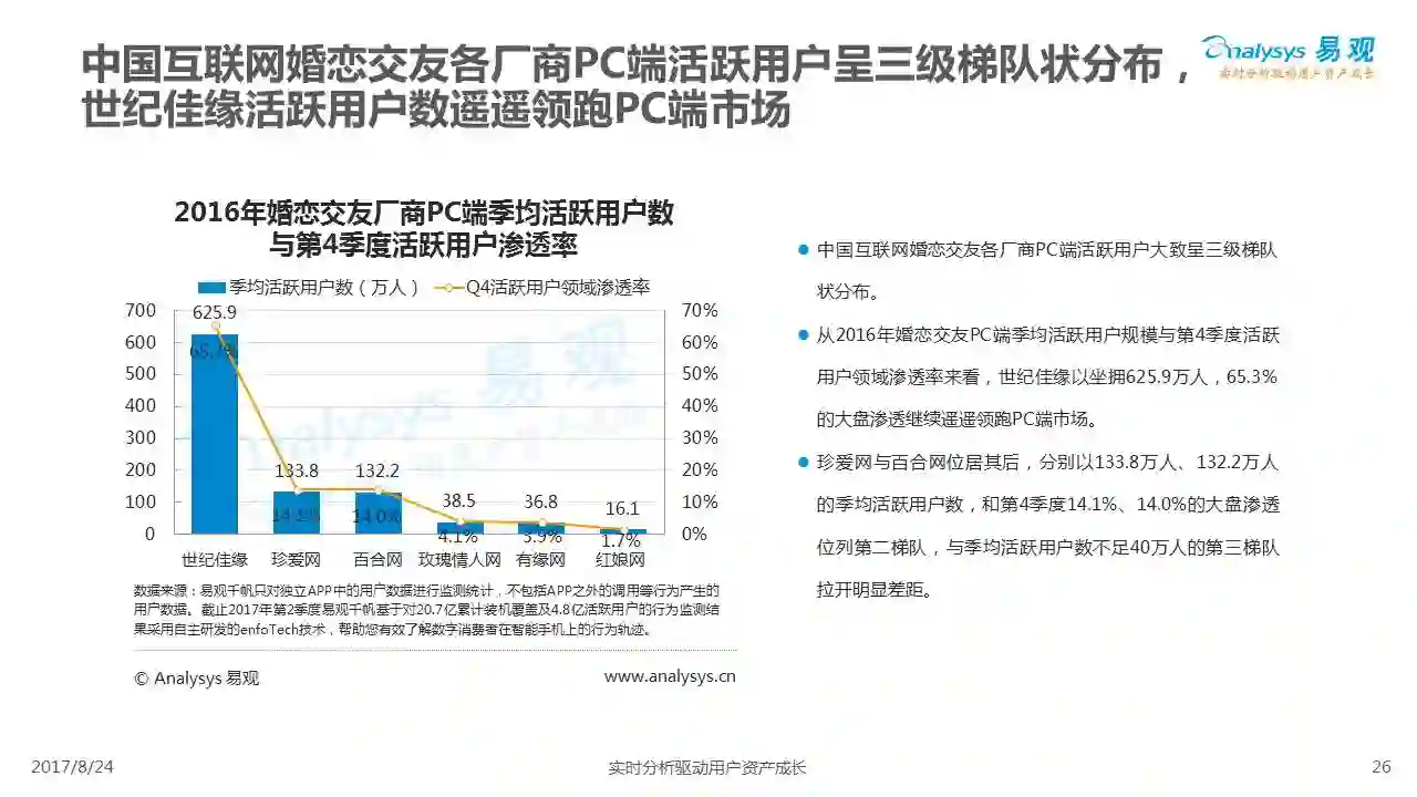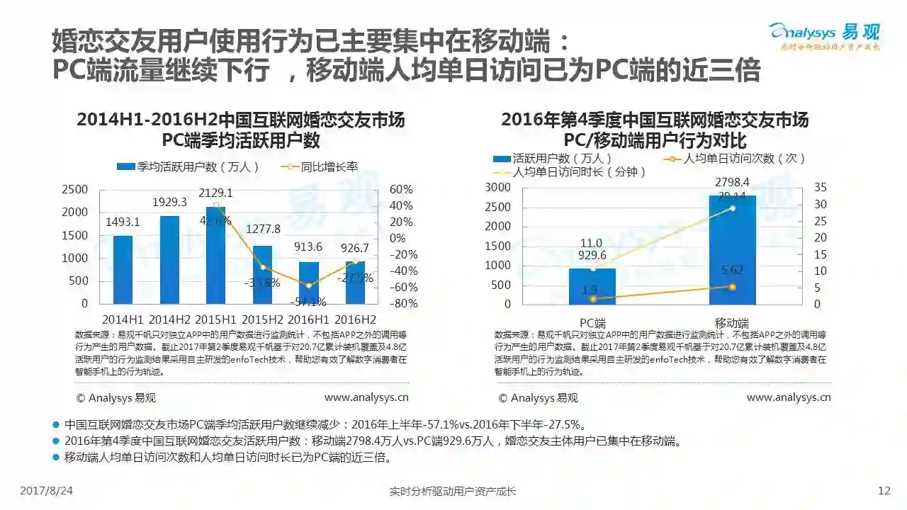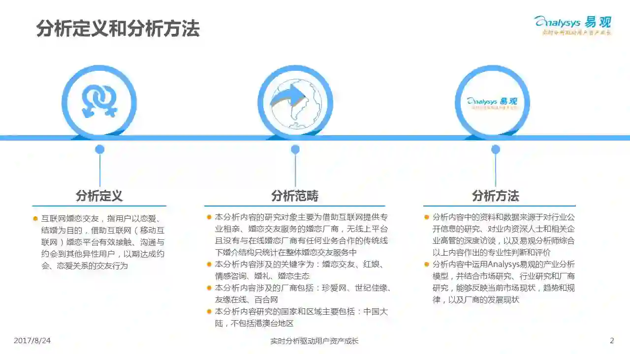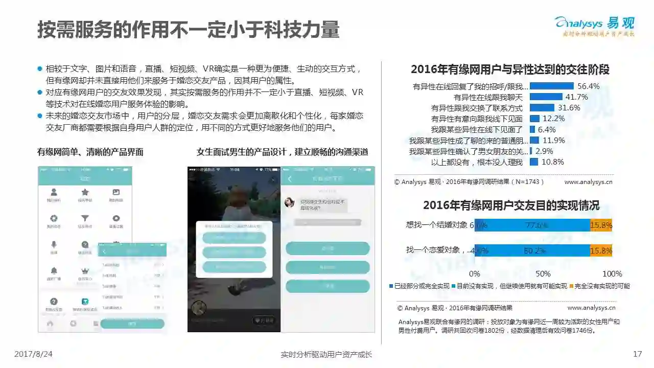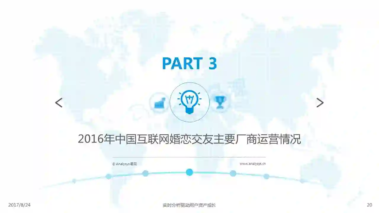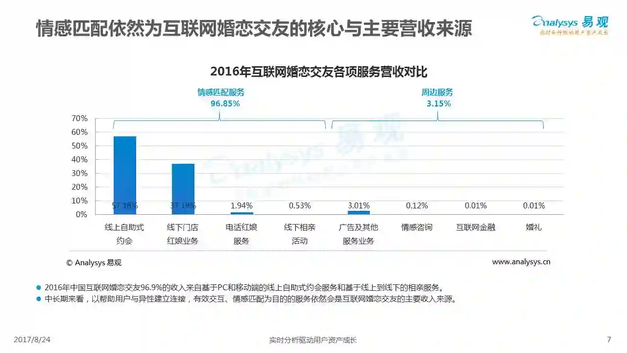 中国互联网婚恋市场增长引擎,随时间推移与市场变化而演变,情感匹配依然为互联网婚恋交友的核心与主要营收来源,婚恋全产业链建设还有很长的路要走。易观为您带来《2017中国互联网婚恋交友服务年度分析》,愿连理枝花繁叶茂,比翼鸟长长久久。
