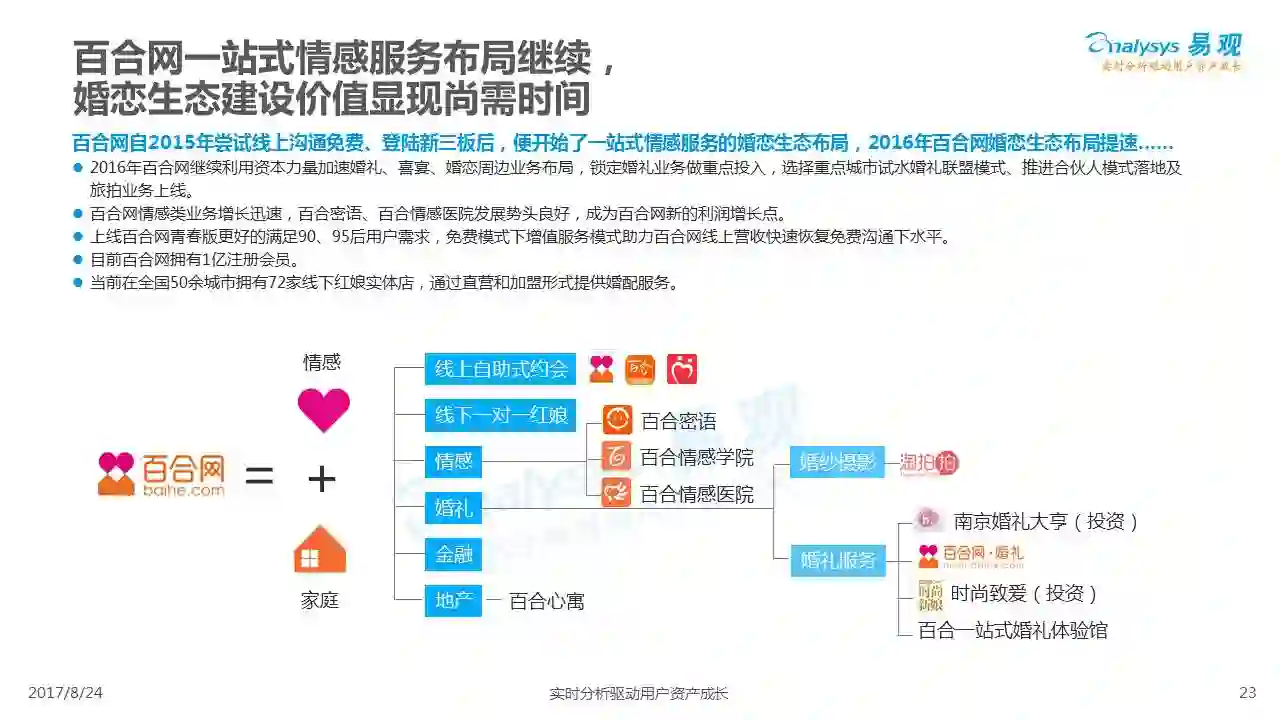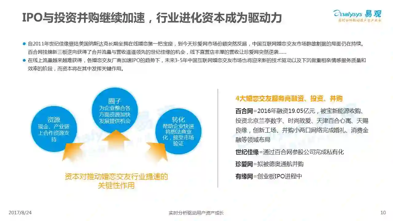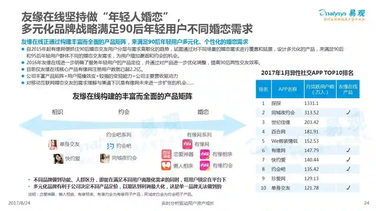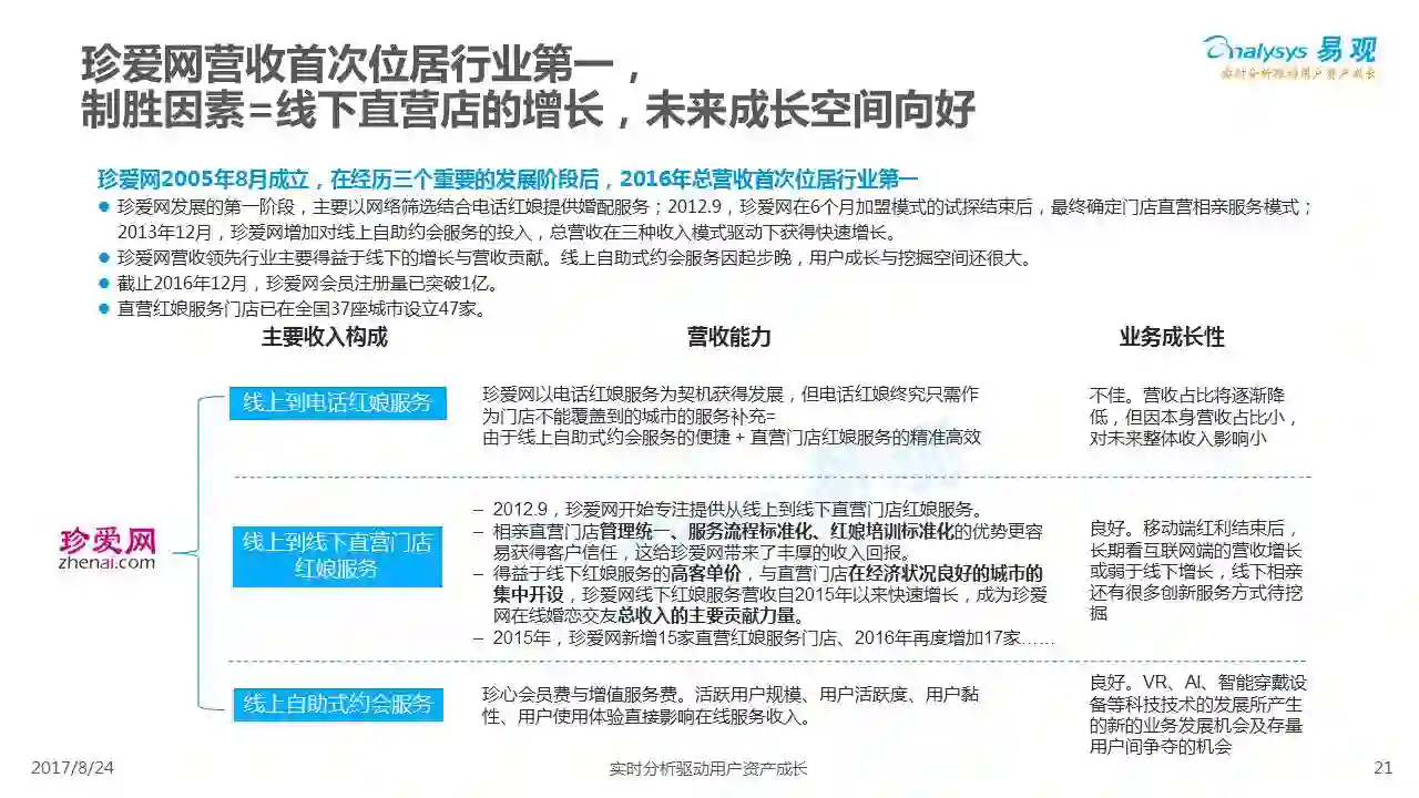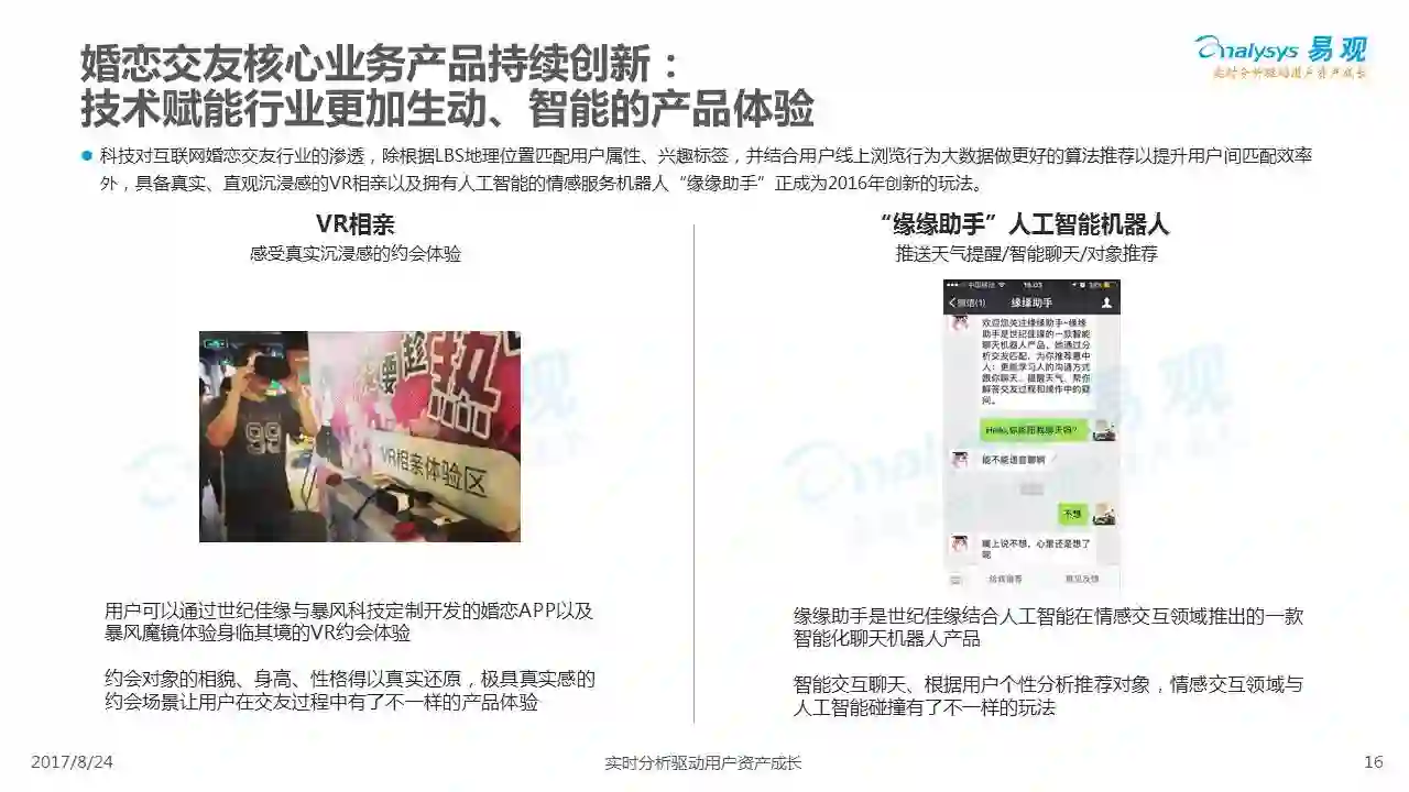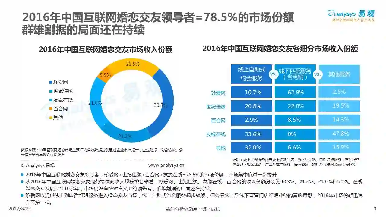 中国互联网婚恋市场增长引擎,随时间推移与市场变化而演变,情感匹配依然为互联网婚恋交友的核心与主要营收来源,婚恋全产业链建设还有很长的路要走。易观为您带来《2017中国互联网婚恋交友服务年度分析》,愿连理枝花繁叶茂,比翼鸟长长久久。