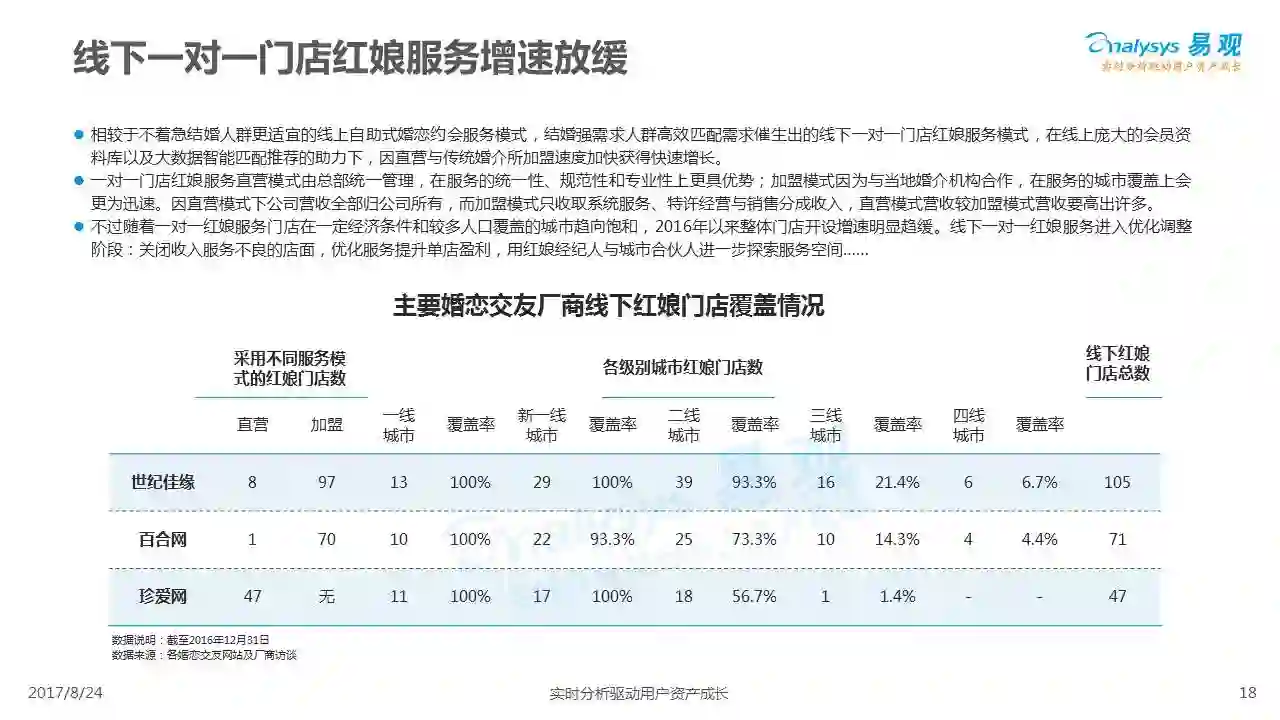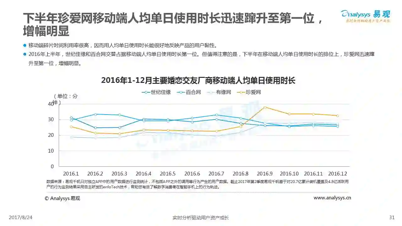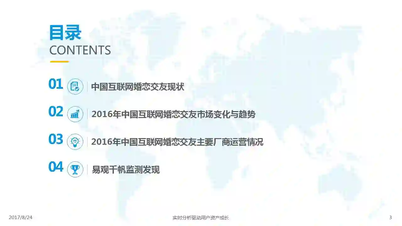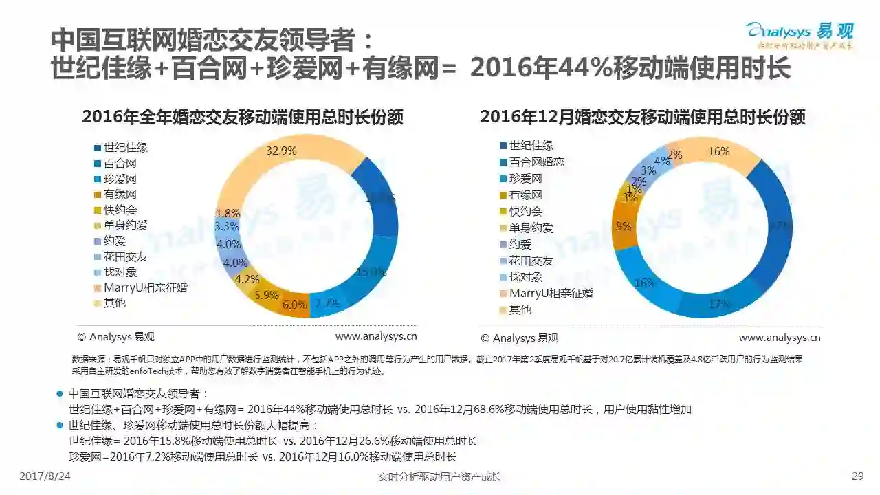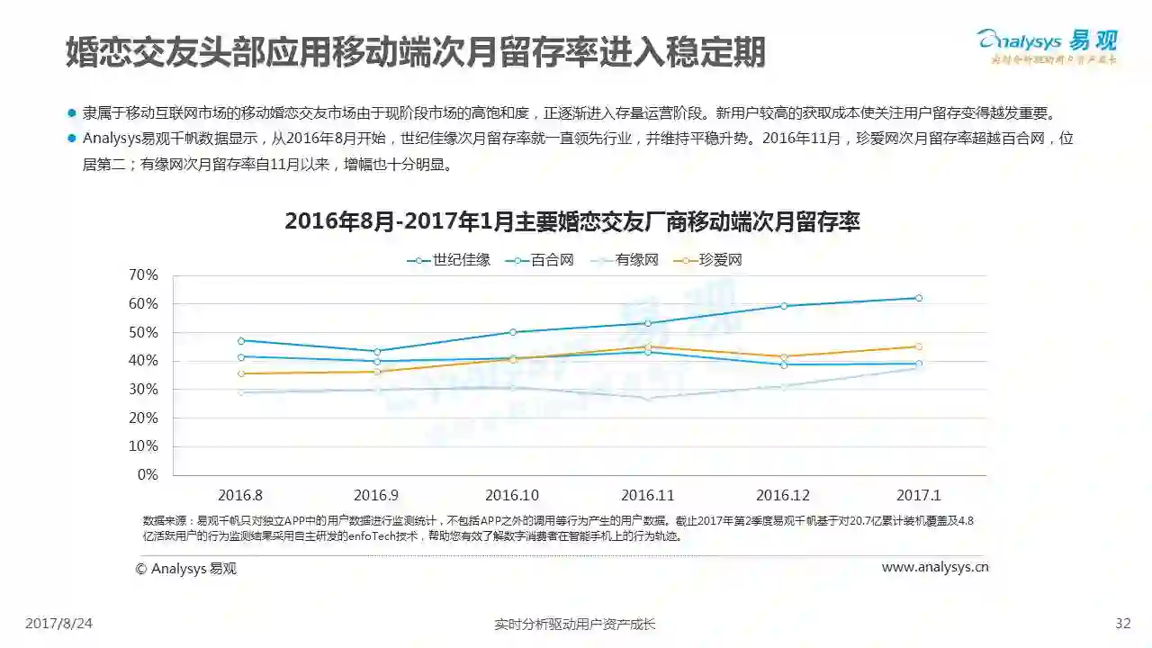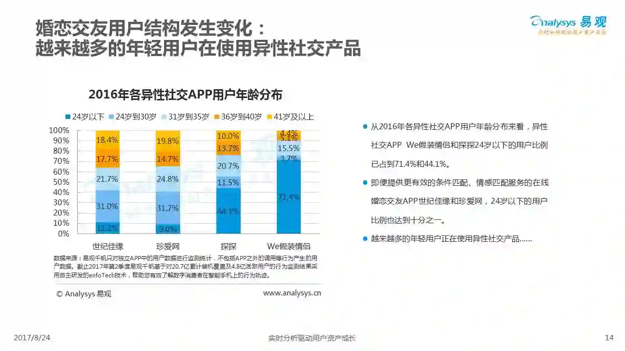 中国互联网婚恋市场增长引擎,随时间推移与市场变化而演变,情感匹配依然为互联网婚恋交友的核心与主要营收来源,婚恋全产业链建设还有很长的路要走。易观为您带来《2017中国互联网婚恋交友服务年度分析》,愿连理枝花繁叶茂,比翼鸟长长久久。