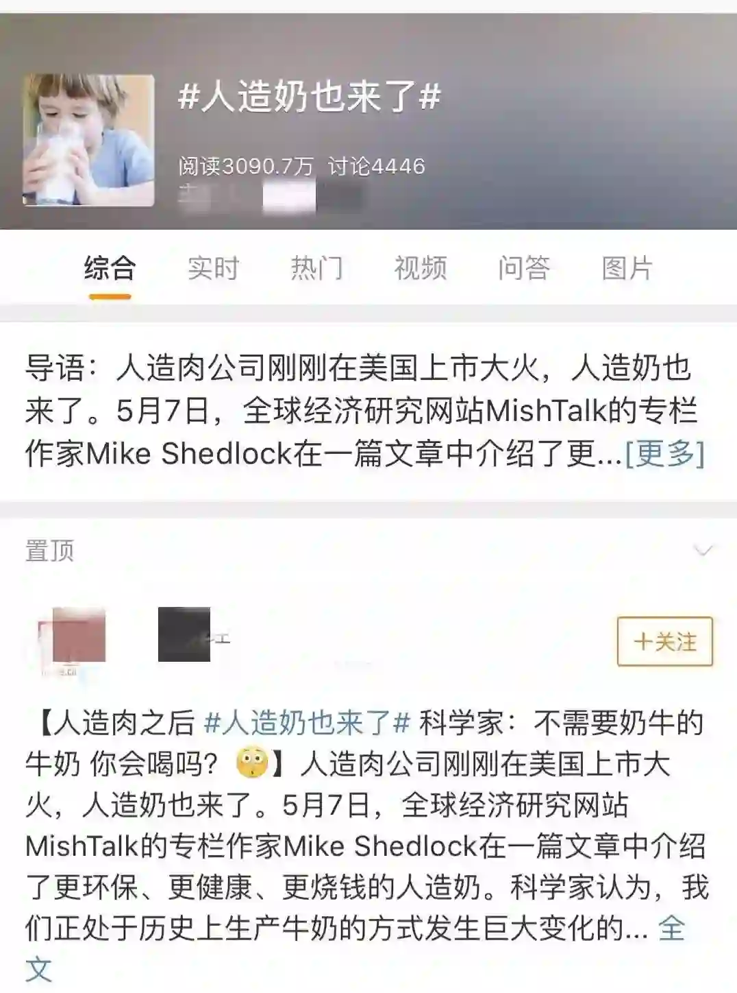 消息一出,引起了众多人的关注。关于“人造奶”的新闻也登上了微博热搜。