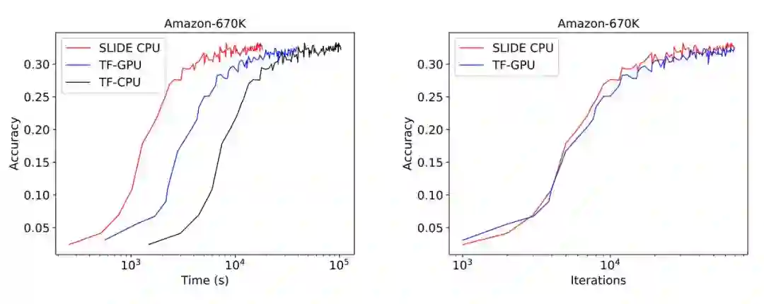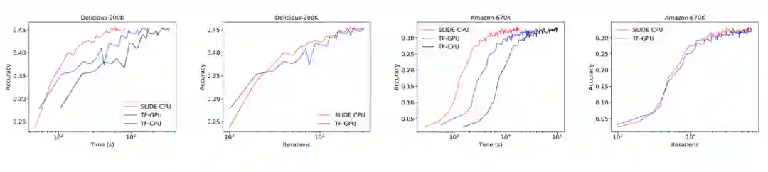 而在需要更大算力的 Amazon-670K 上,TF-GPU 的收敛时间是 SLIDE 的 2.7 倍(2 小时与 5.5 小时)。
