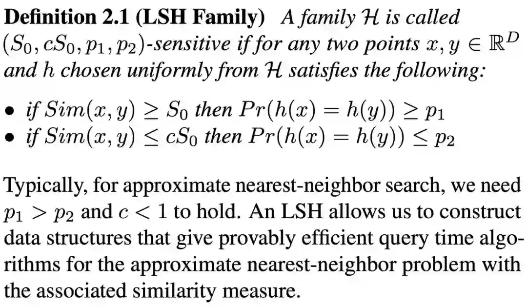 在 Indyk 和 Motwani 在 1998 年的一项研究中表明,对于给定的相似性计算,一类 LSH 函数就足以有效地解决次线性时间中的最近相邻搜索。