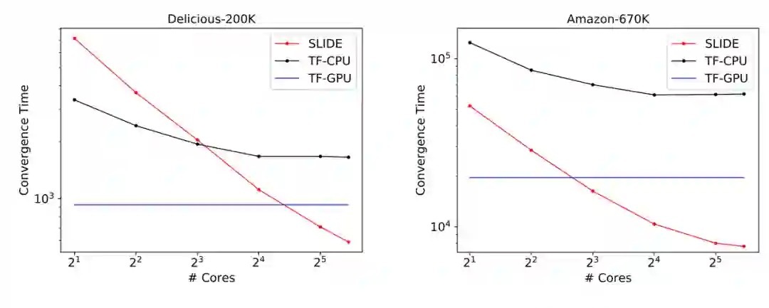 因为能高效利用 CPU 的计算资源,SLIDE 随着 CPU 核心数的 增加,收敛时间还能极大地降低。