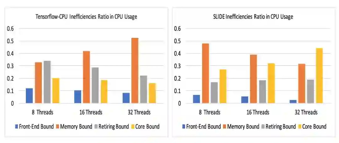 图 6:CPU 低效利用率:Memory-bound 的低效利用率(橙色)对于这两种算法是最显著的。TF-CPU 随着核心数的增加,Memory-bound 低效利用率也会增加,而 SLIDE 会降低。