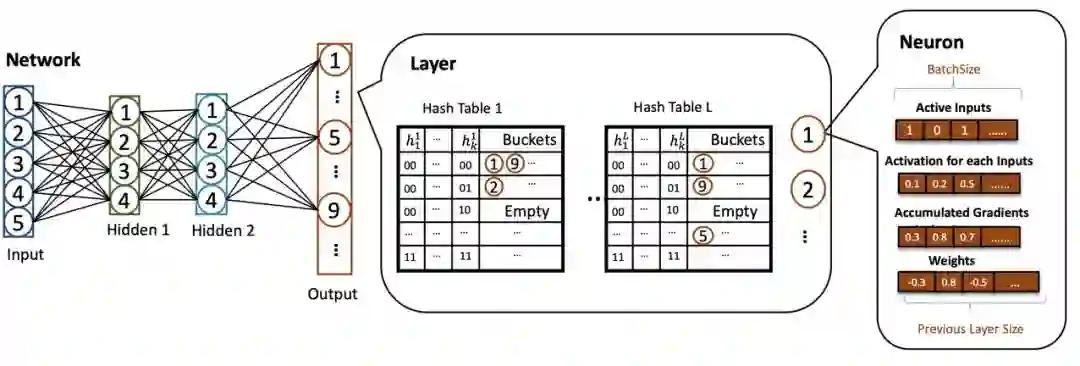 对于每个层的模块,其都是由神经元和一些哈希表组成——即将神经元的 ids 转换成哈希。