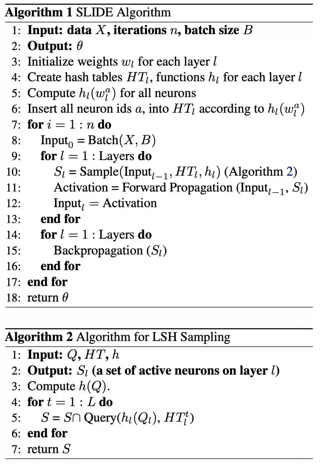 SLIDE 中的算法,包括框架(算法 1)和哈希采样(算法 2)。