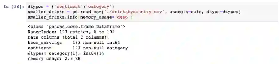 通过将continent列读取为category数据类型,我们进一步地把DataFrame的空间大小缩小至2.3KB。