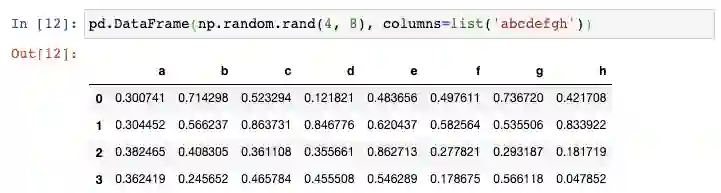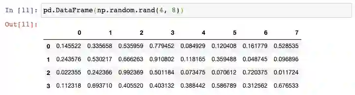 现在如果你需要创建一个更大的DataFrame,上述方法则需要太多的输入。在这种情况下,你可以使用Numpy的random.rand()函数,告诉它行数和列数,将它传递给DataFrame constructor:
