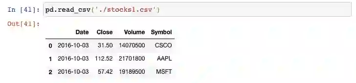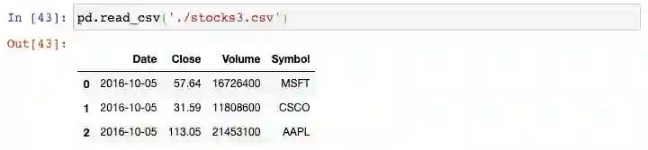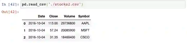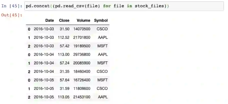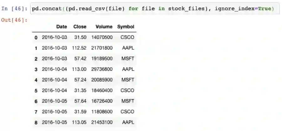 我们以生成器表达式用read_csv()函数来读取每个文件,并将结果传递给concat()函数,这会将单个的DataFrame按行来组合: