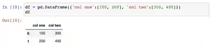 假设你需要创建一个示例DataFrame。有很多种实现的途径,我最喜欢的方式是传一个字典给DataFrame constructor,其中字典中的keys为列名,values为列的取值。