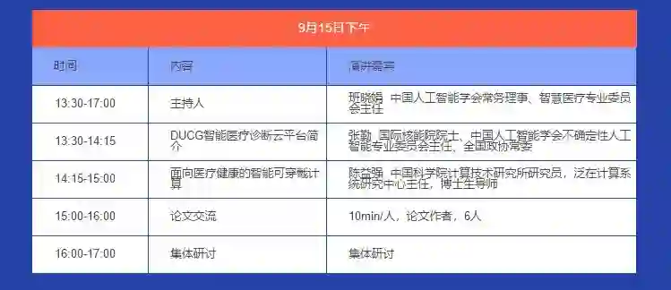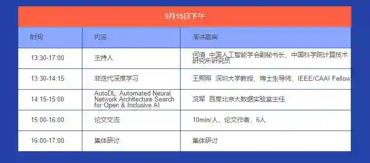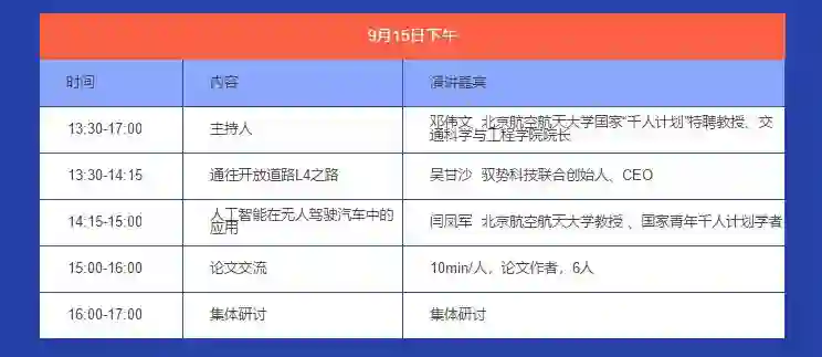 9月15日下午,会有三场精彩专场报告会同时进行。三场报告会以AI为核心,专题涉及AI+汽车、AI+医疗、AI前沿技术,设有专题报告和论文交流两大模块。