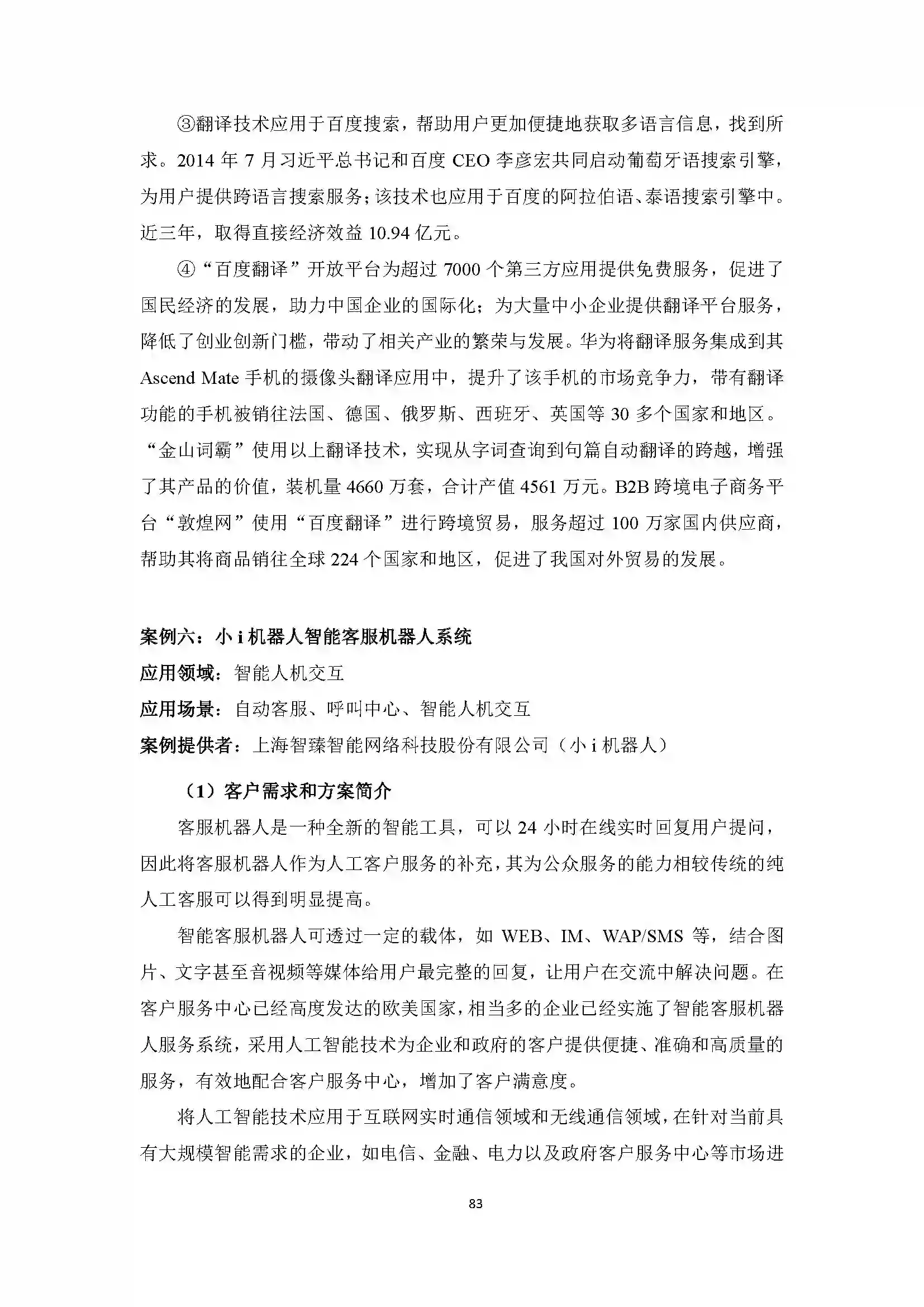 (3)提供人工智能在线服务。此类厂商一般为传统的云服务提供厂商,主 要依托其已有的云计算和大数据应用的用户资源,聚集用户的需求和行业属性, 为客户提供多类型的人工智能服务;从各类模型算法和计算框架的 API 等特定 应用平台到特定行业的整体解决方案等,进一步吸引大量的用户使用,从而进一 步完善其提供的人工智能服务。此类厂商主要提供相对通用的人工智能服务,同 时也会关注一些重点行业和领域。