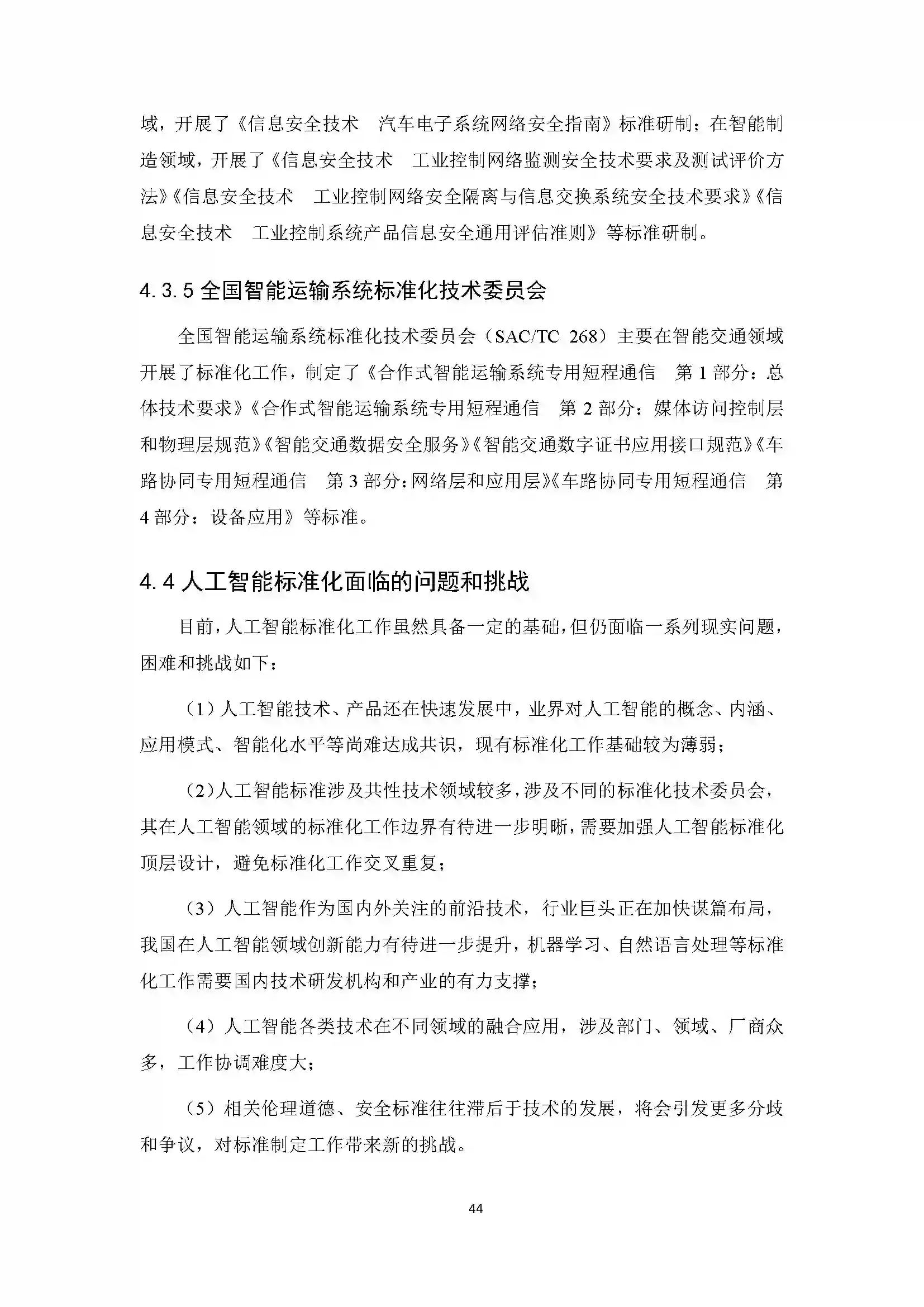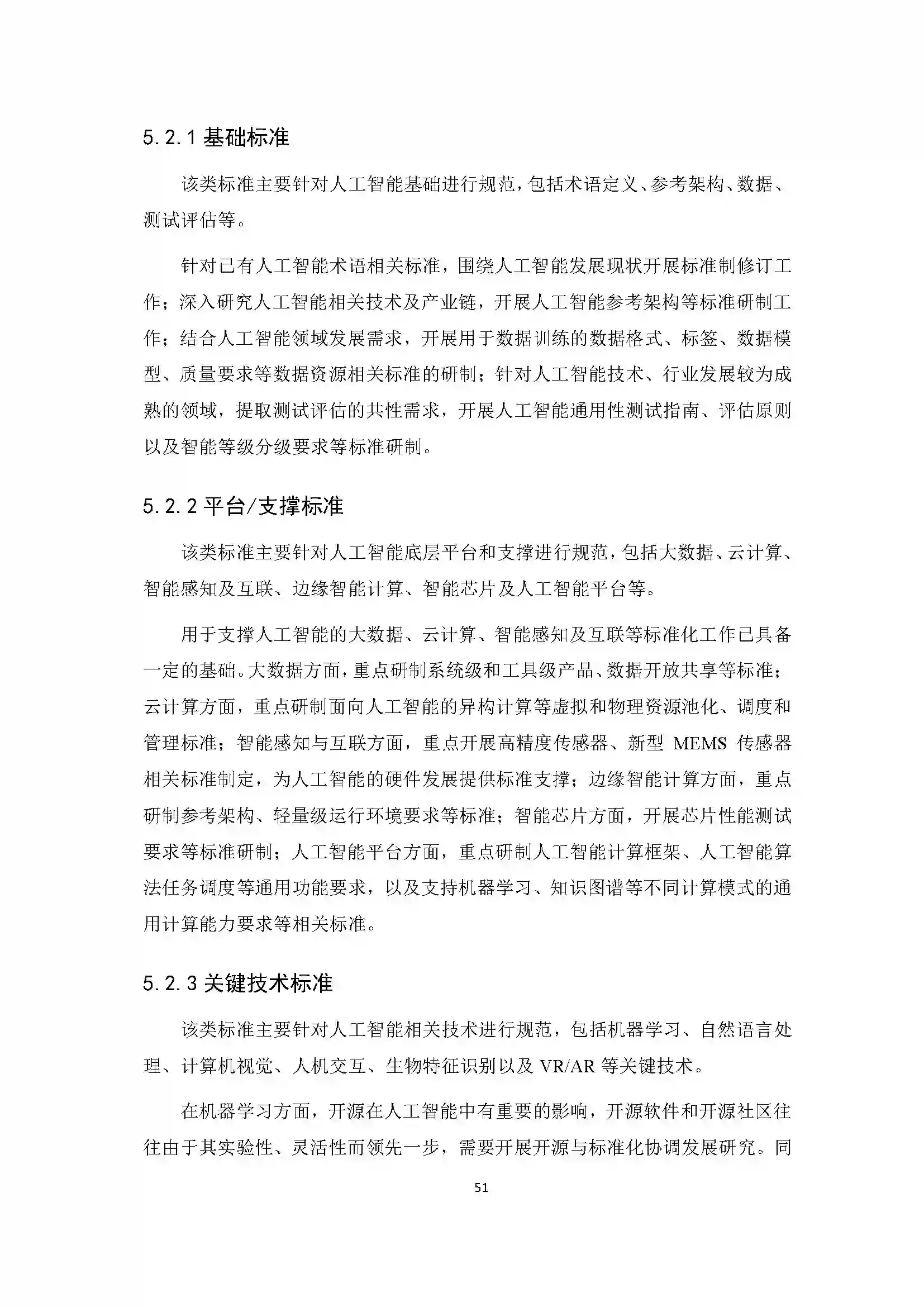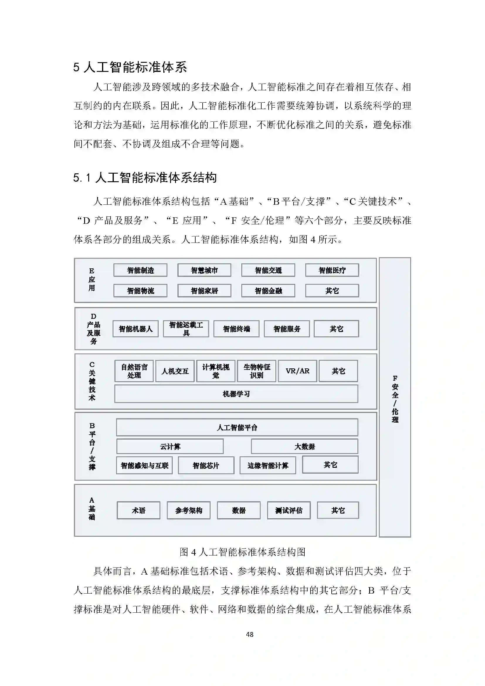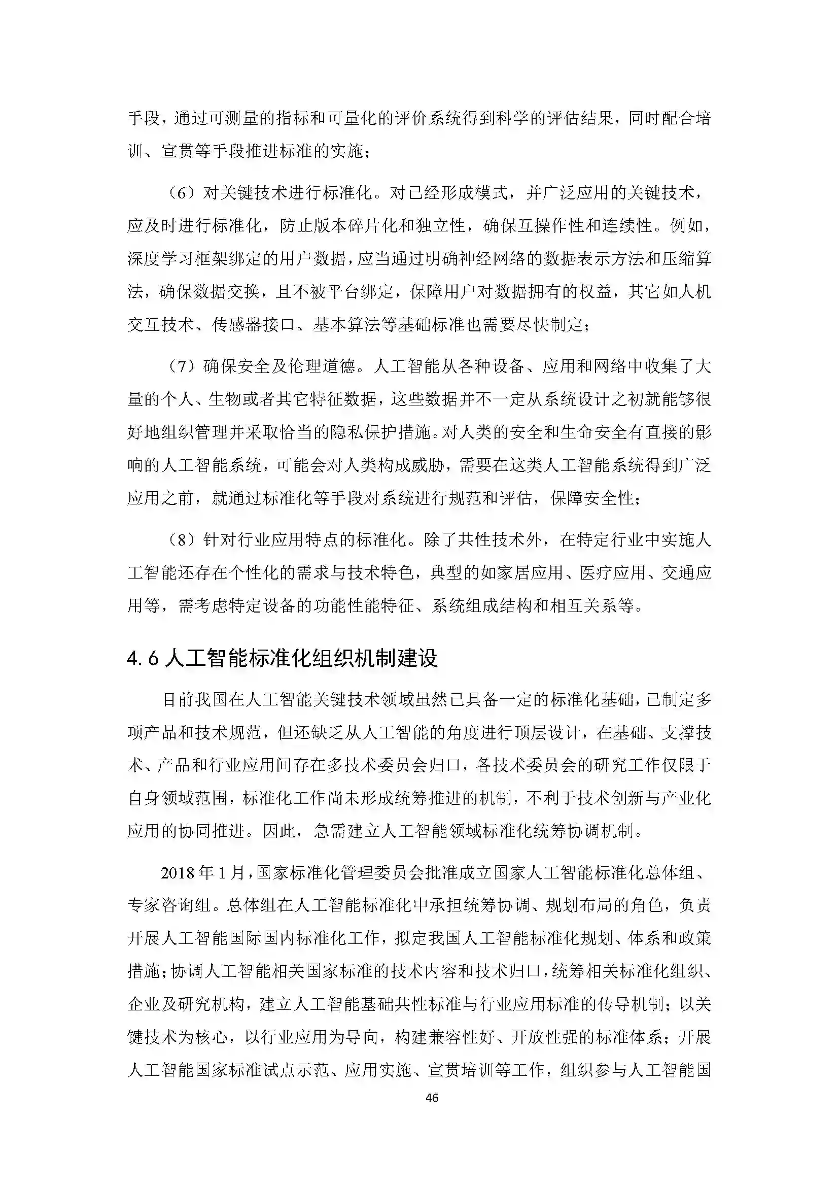 标准化工作对人工智能及其产业发展具有基础性、支撑性、引领性的作用, 既是推动产业创新发展的关键抓手,也是产业竞争的制高点。当前,在我国人工 智能相关产品和服务不断丰富的同时,也出现了标准化程度不足的问题。人工智 能涉及众多领域,虽然某些领域已具备一定的标准化基础,但是这些分散的标准 化工作并不足以完全支撑整个人工智能领域。另一方面,人工智能属于新兴领域, 发展方兴未艾,从世界范围来看,标准化工作仍在起步过程中,尚未形成完善的 标准体系,我国基本与国外处于同一起跑线,存在快速突破的机会窗口。只要瞄 准机会,快速布局,完全有可能抢占标准创新的制高点,反之,则有可能丧失良 机。因此,迫切需要把握机遇,加快对人工智能技术及产业发展的研究,系统梳 理、加快研制人工智能各领域的标准体系,明确标准之间的依存性与制约关系, 建立统一完善的标准体系,以标准的手段促进我国人工智能技术、产业蓬勃发展。