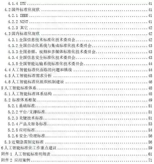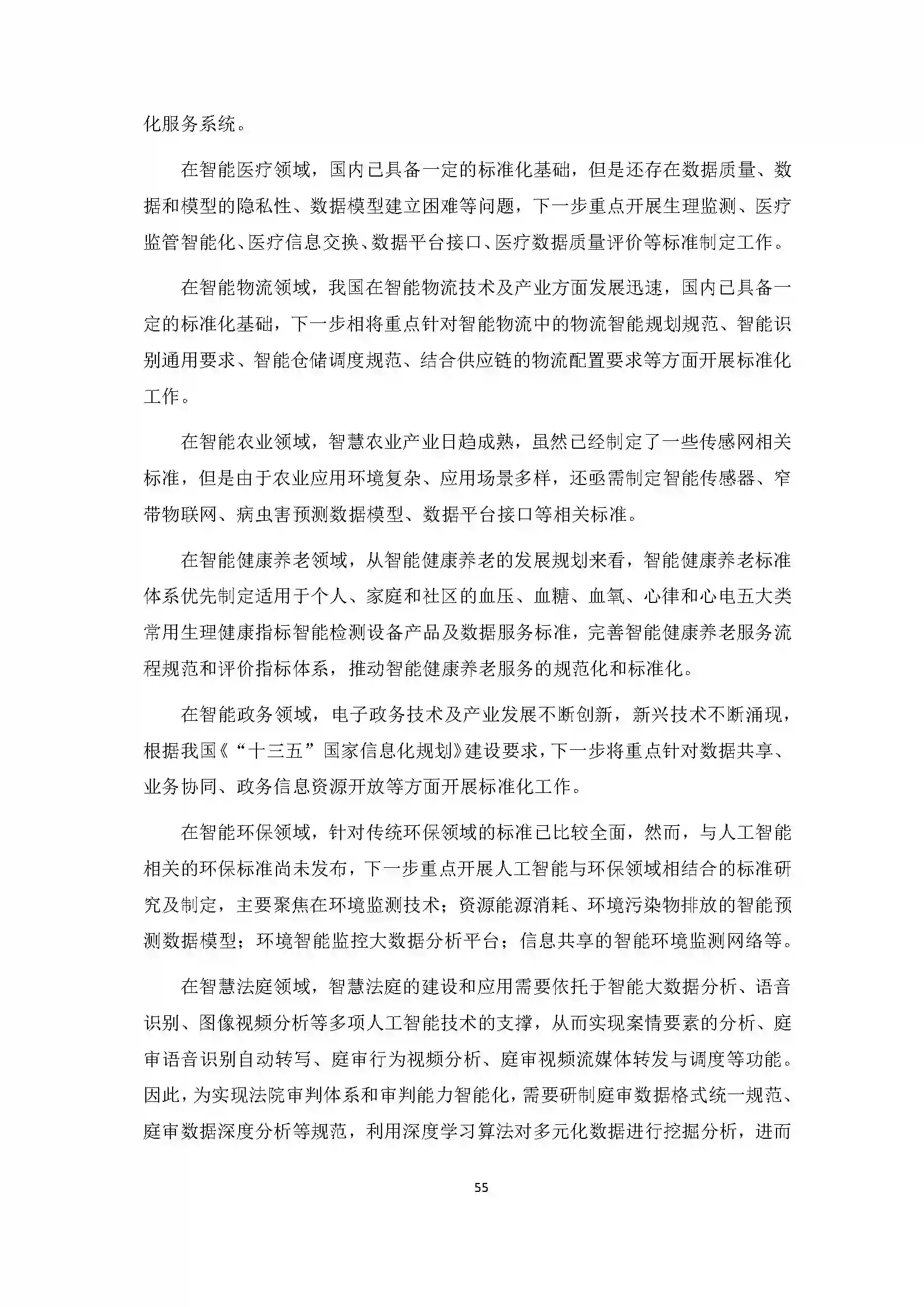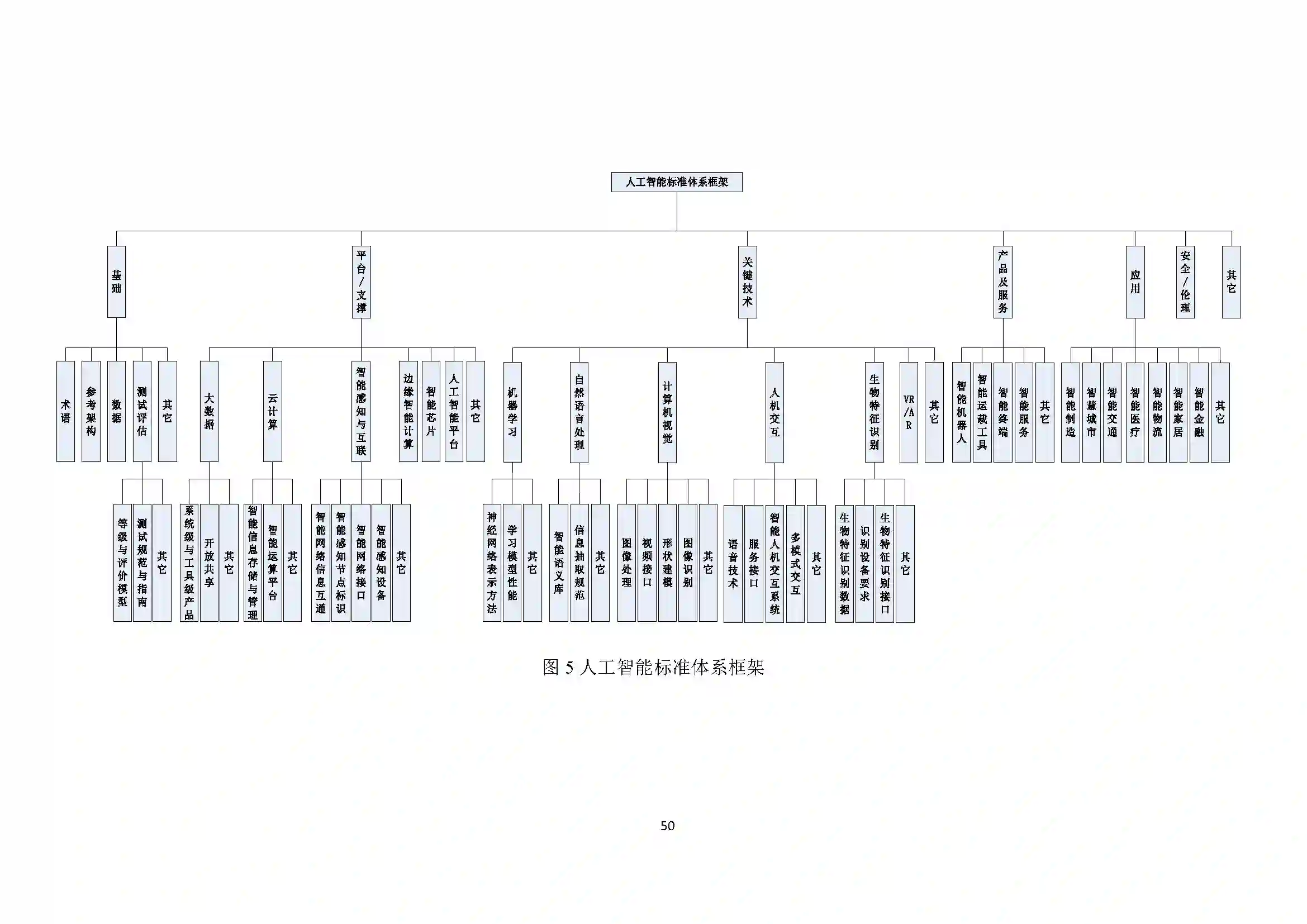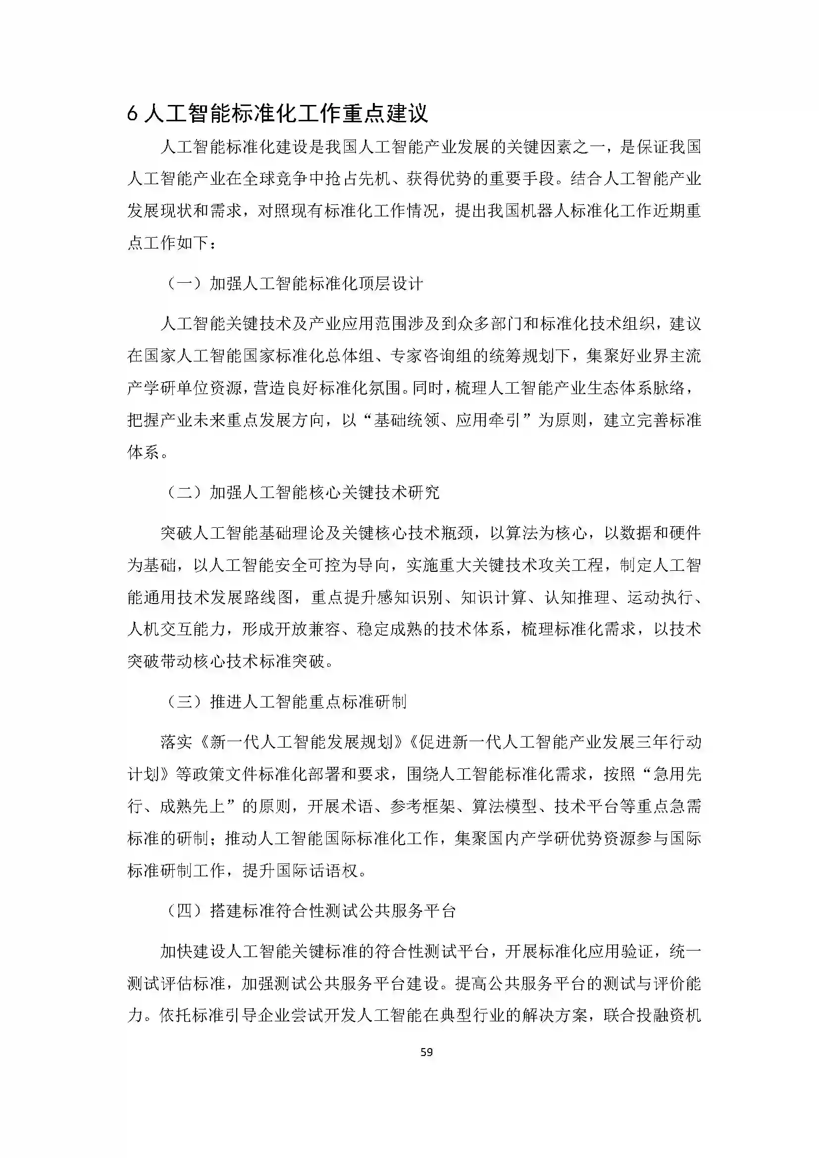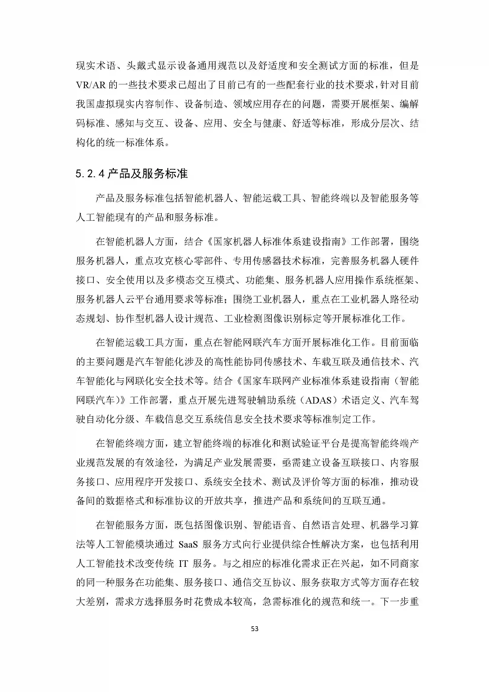 标准化工作对人工智能及其产业发展具有基础性、支撑性、引领性的作用, 既是推动产业创新发展的关键抓手,也是产业竞争的制高点。当前,在我国人工 智能相关产品和服务不断丰富的同时,也出现了标准化程度不足的问题。人工智 能涉及众多领域,虽然某些领域已具备一定的标准化基础,但是这些分散的标准 化工作并不足以完全支撑整个人工智能领域。另一方面,人工智能属于新兴领域, 发展方兴未艾,从世界范围来看,标准化工作仍在起步过程中,尚未形成完善的 标准体系,我国基本与国外处于同一起跑线,存在快速突破的机会窗口。只要瞄 准机会,快速布局,完全有可能抢占标准创新的制高点,反之,则有可能丧失良 机。因此,迫切需要把握机遇,加快对人工智能技术及产业发展的研究,系统梳 理、加快研制人工智能各领域的标准体系,明确标准之间的依存性与制约关系, 建立统一完善的标准体系,以标准的手段促进我国人工智能技术、产业蓬勃发展。