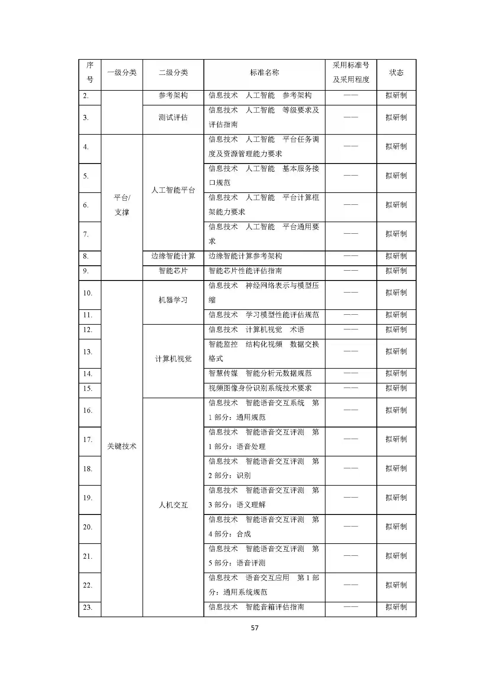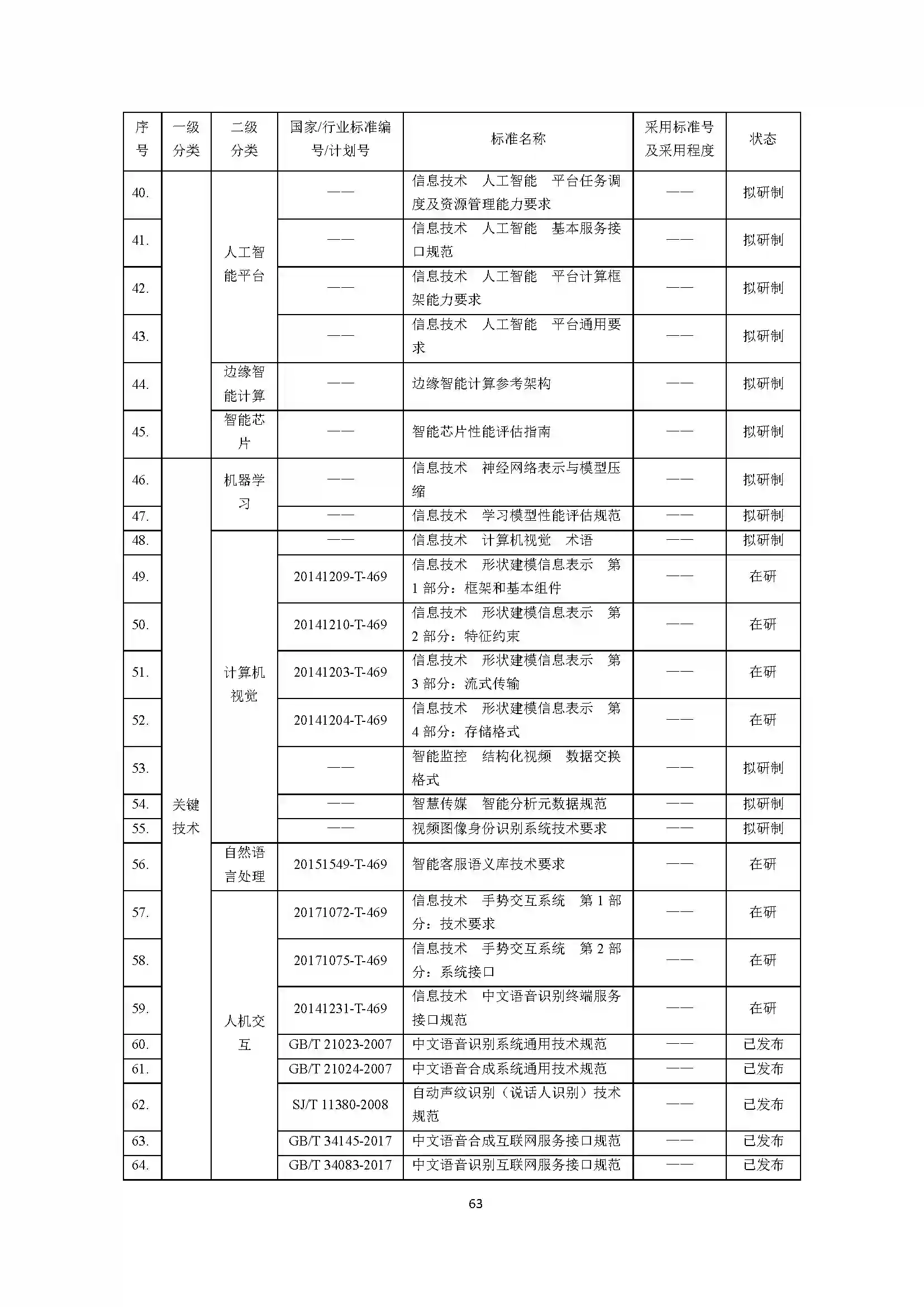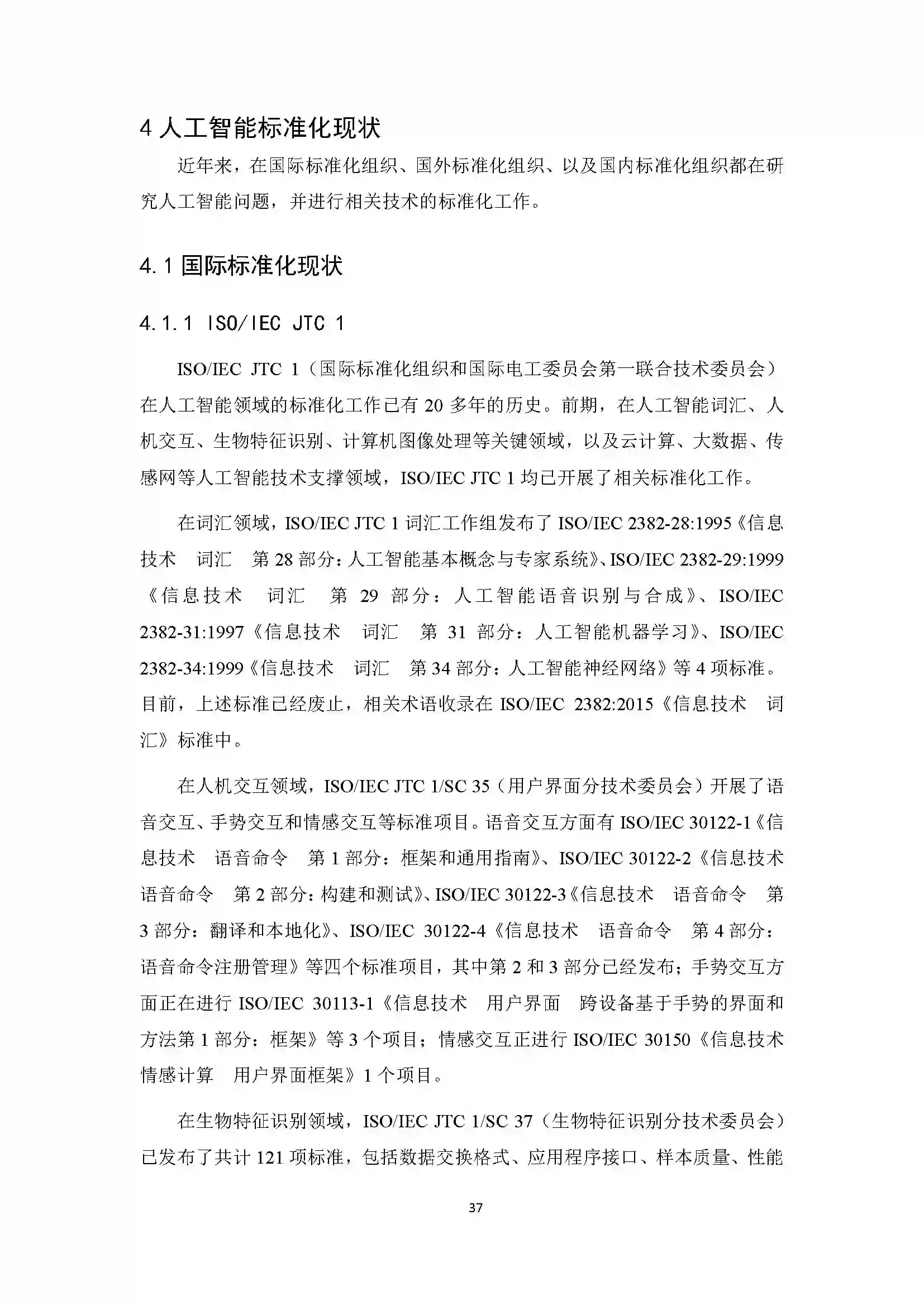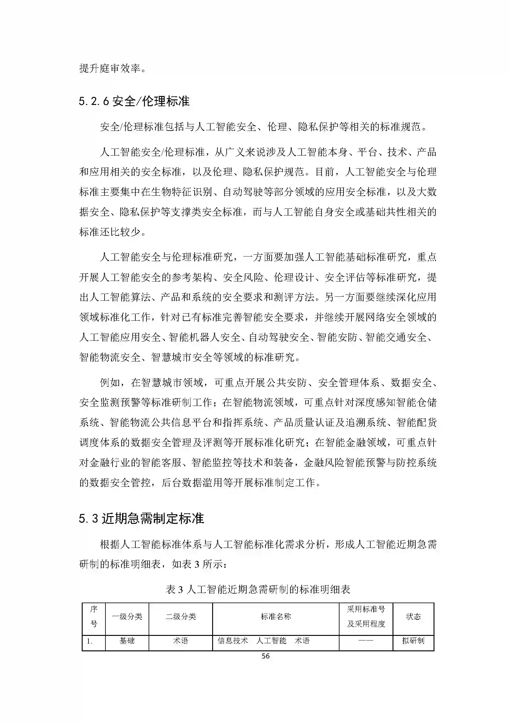 标准化工作对人工智能及其产业发展具有基础性、支撑性、引领性的作用, 既是推动产业创新发展的关键抓手,也是产业竞争的制高点。当前,在我国人工 智能相关产品和服务不断丰富的同时,也出现了标准化程度不足的问题。人工智 能涉及众多领域,虽然某些领域已具备一定的标准化基础,但是这些分散的标准 化工作并不足以完全支撑整个人工智能领域。另一方面,人工智能属于新兴领域, 发展方兴未艾,从世界范围来看,标准化工作仍在起步过程中,尚未形成完善的 标准体系,我国基本与国外处于同一起跑线,存在快速突破的机会窗口。只要瞄 准机会,快速布局,完全有可能抢占标准创新的制高点,反之,则有可能丧失良 机。因此,迫切需要把握机遇,加快对人工智能技术及产业发展的研究,系统梳 理、加快研制人工智能各领域的标准体系,明确标准之间的依存性与制约关系, 建立统一完善的标准体系,以标准的手段促进我国人工智能技术、产业蓬勃发展。