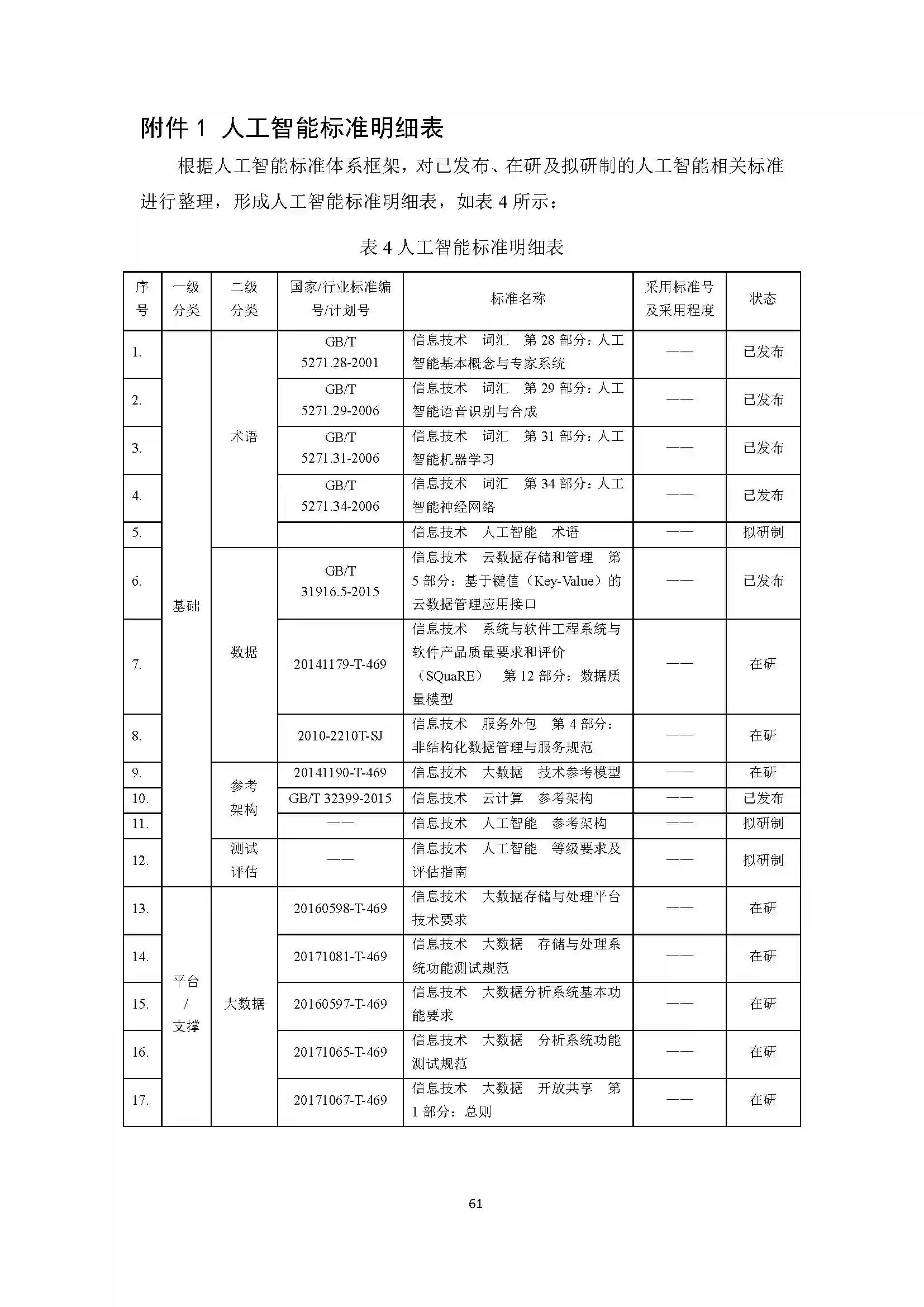 (一)标准化工作有利于加快人工智能技术创新和成果转化。现阶段人工智 能技术发展迅速,市场上逐步出现了可规模化、可商业化的产品和应用,需要以 标准化的手段固化技术成果,实现快速创新推广;