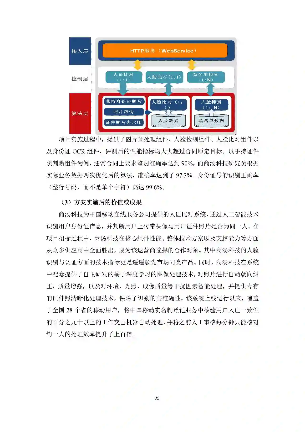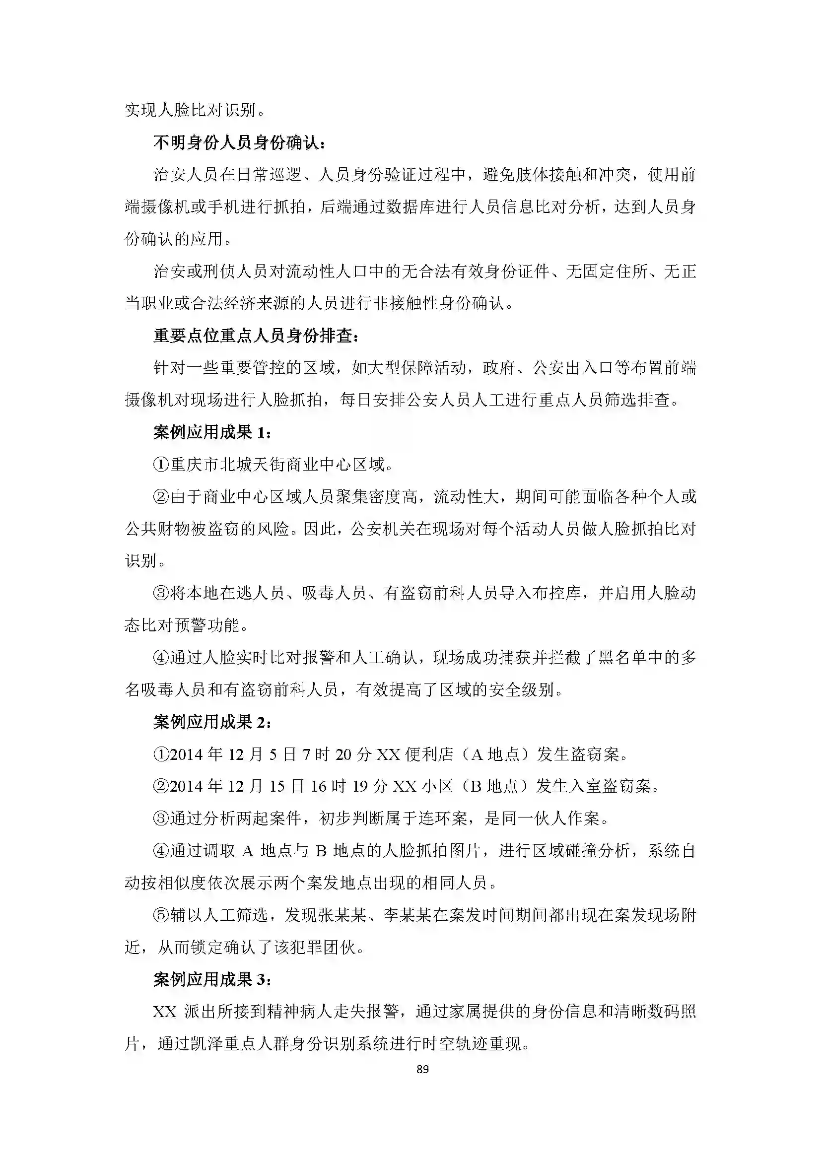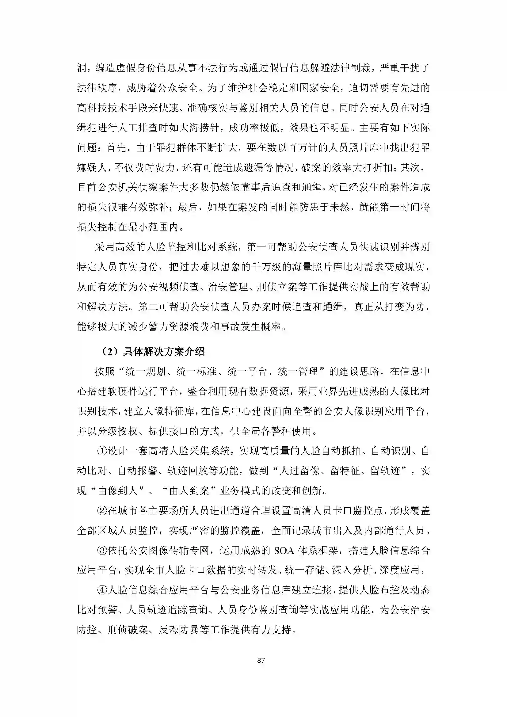 当前,高清视频、智能分析等技术的发展,使得安防从传统的被动防御向主 动判断和预警发展,行业也从单一的安全领域向多行业应用发展,进而提升生产 效率并提高生活智能化程度,为更多的行业和人群提供可视化及智能化方案。用 户面对海量的视频数据,已无法简单利用人海战术进行检索和分析,需要采用人 工智能技术作专家系统或辅助手段,实时分析视频内容,探测异常信息,进行风 险预测。从技术方面来讲,目前国内智能安防分析技术主要集中在两大类:一类 是采用画面分割前景提取等方法对视频画面中的目标进行提取检测,通过不同的 规则来区分不同的事件,从而实现不同的判断并产生相应的报警联动等,例如: 区域入侵分析、打架检测、人员聚集分析、交通事件检测等;另一类是利用模式 识别技术,对画面中特定的物体进行建模,并通过大量样本进行训练,从而达到 对视频画面中的特定物体进行识别,如车辆检测、人脸检测、人头检测(人流统 计)等应用。