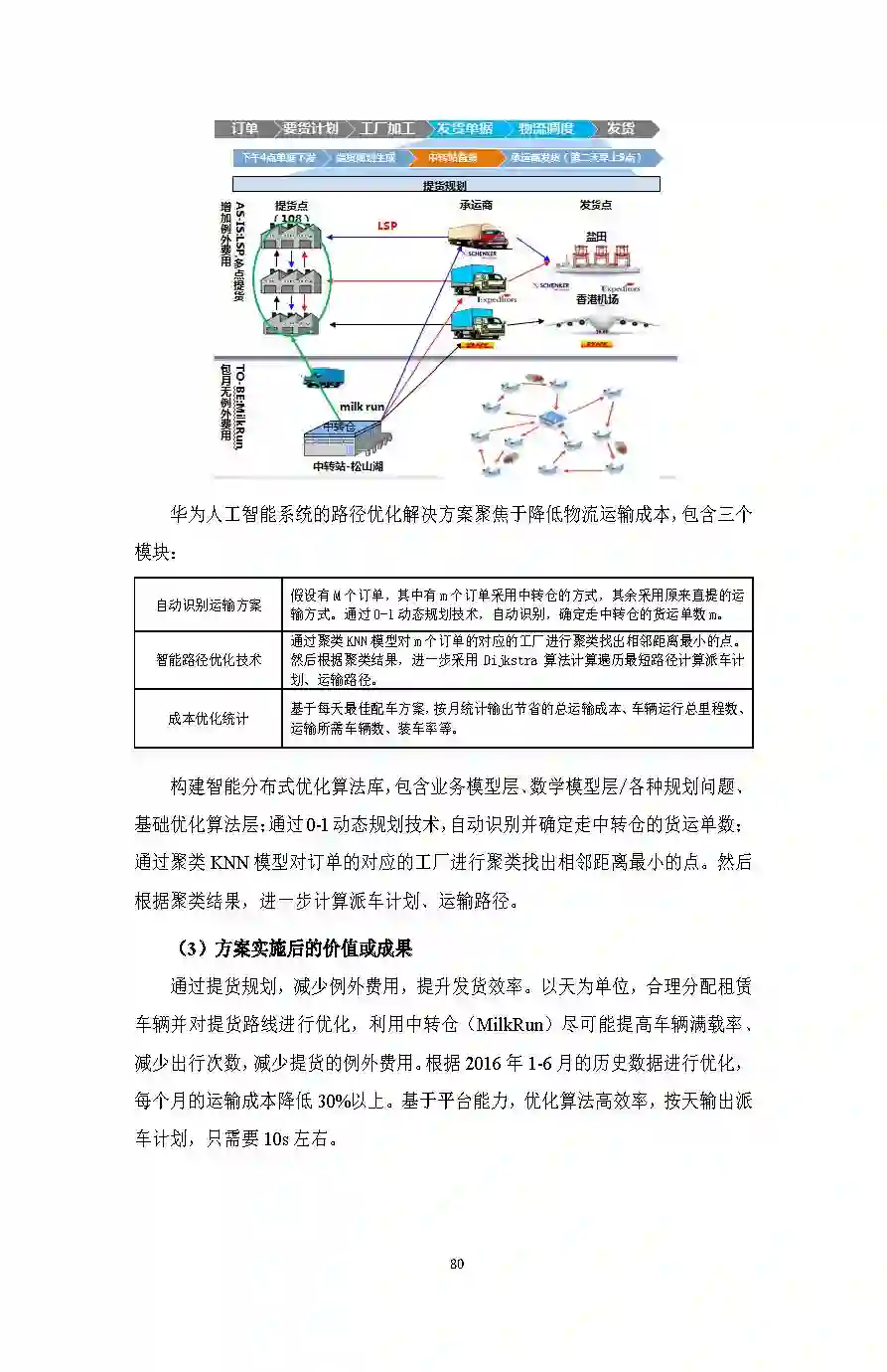 传统物流企业在利用条形码、射频识别技术、传感器、全球定位系统等方面 优化改善运输、仓储、配送装卸等物流业基本活动,同时也在尝试使用智能搜索、 推理规划、计算机视觉以及智能机器人等技术,实现货物运输过程的自动化运作 和高效率优化管理,提高物流效率。例如,在仓储环节,利用大数据智能通过分 析大量历史库存数据,建立相关预测模型,实现物流库存商品的动态调整。大数据智能也可以支撑商品配送规划,进而实现物流供给与需求匹配、物流资源优化 与配置等。在货物搬运环节,加载计算机视觉、动态路径规划等技术的智能搬运 机器人(如搬运机器人、货架穿梭车、分拣机器人等)得到广泛应用,大大减少 了订单出库时间,使物流仓库的存储密度、搬运的速度、拣选的精度均有大幅度 提升。