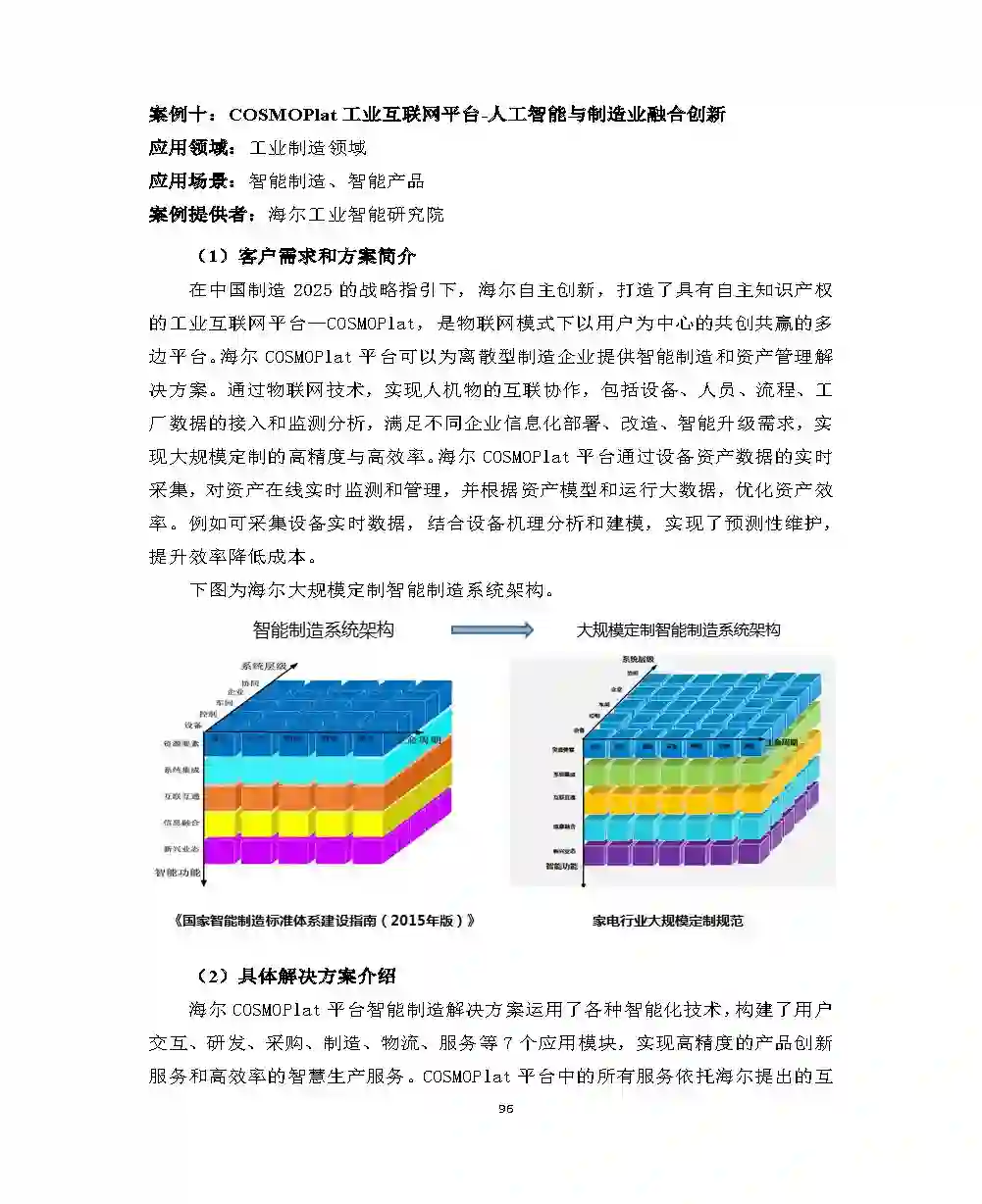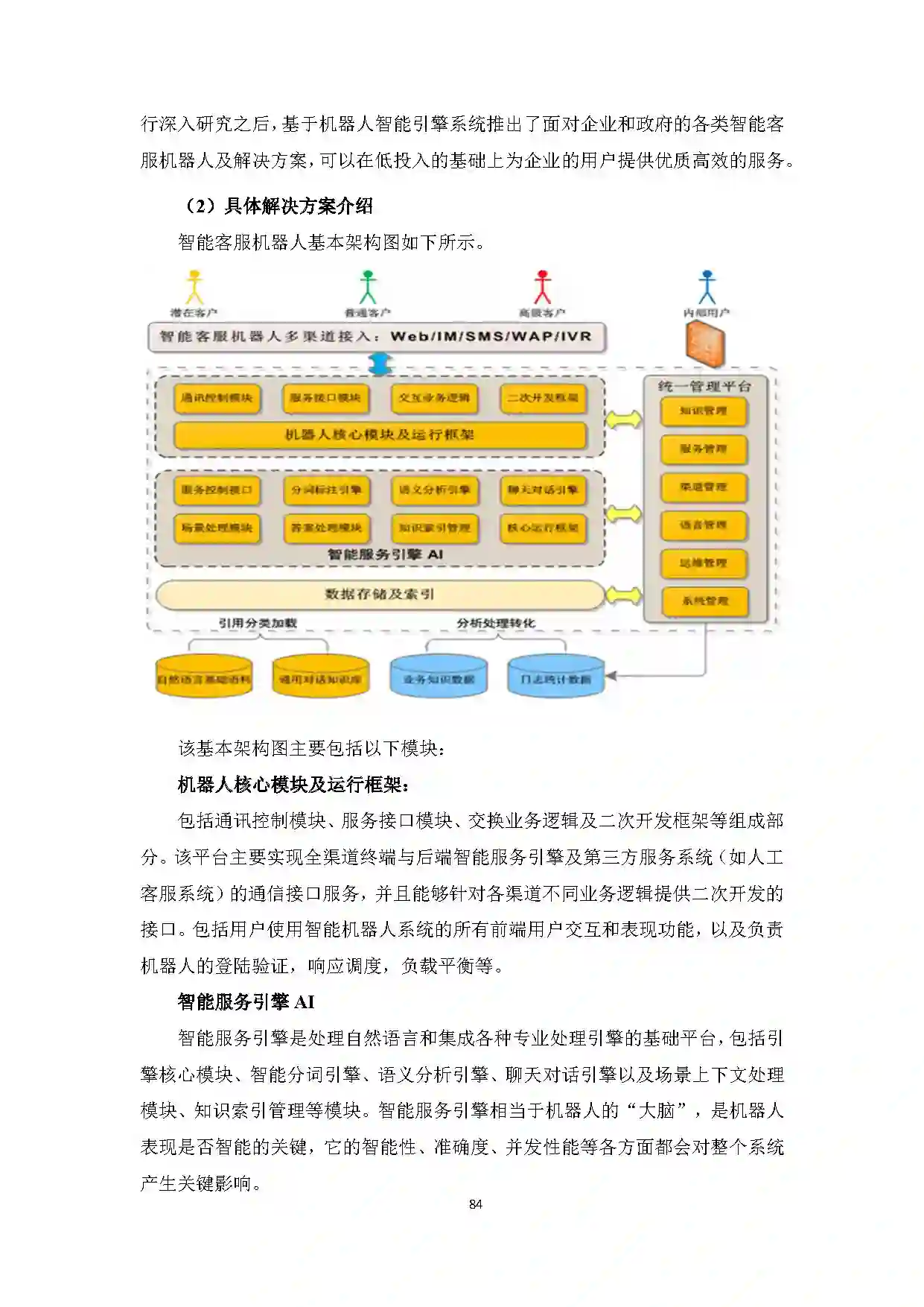 (2)提供人工智能的整体解决方案。此类厂商主要针对用户或者行业需求, 设计和提供包括软、硬件一体的行业人工智能解决方案,整体方案中集成多种人 工智能算法模型以及软、硬件环境,帮助用户或行业解决特定的问题。此类厂商 重点关注人工智能在特定领域或者特定行业的应用。