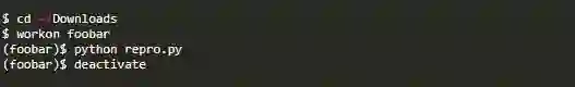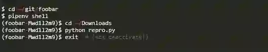 Pipenv的另一个问题是使用工作目录来选择虚拟环境。[3]假设我是图书馆的作者。我的foobar库的一个用户刚刚报告了一个bug,并附上了一个repro.py文件让我重现这个问题。我将该文件下载到我的文件系统上的~/Download目录。用普通的旧虚拟器可以很容易地用以下语句在备用外壳中重现: