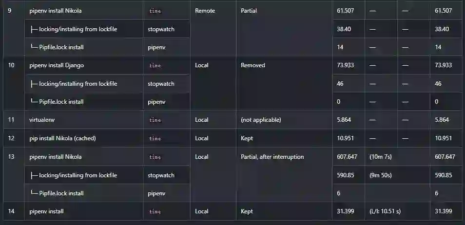 (更新于2018-07-22:在Pipenv测量中:第一项是Pipenv可执行的总时间。第二项是等待Pipenv完成其“主要”任务:锁定依赖项并安装它们。计时在Pipenv开始锁定依赖项时开始,在提示符出现时结束。第三项是Pipenv报告的安装时间。因此,Pipenv安装时间⊇锁定/安装时间⊇Pipfile.lock安装时间。)