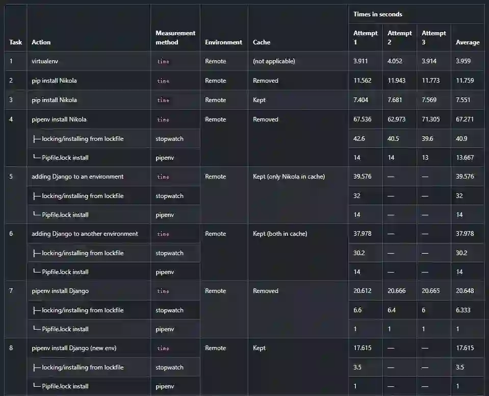 Pipenv以速度慢而闻名。但它到底有多慢?我对它进行了测试。我使用了两个测试环境: