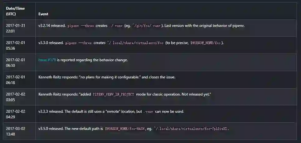 在一个月的时间里,虚拟主机的位置发生了两次变化。如果用户没有读取Changelog,也没有手动干预(同样值得注意的是,在问题中和v3.3.4的Changelog中都提到了选项名),那么他们就会有一个旧.venv目录,因为他们采用了新的方案。然后,在切换到v3.5.0之后,它们将在主目录中隐藏一个陈旧的虚拟主机,因为pipenv决定添加碎片。