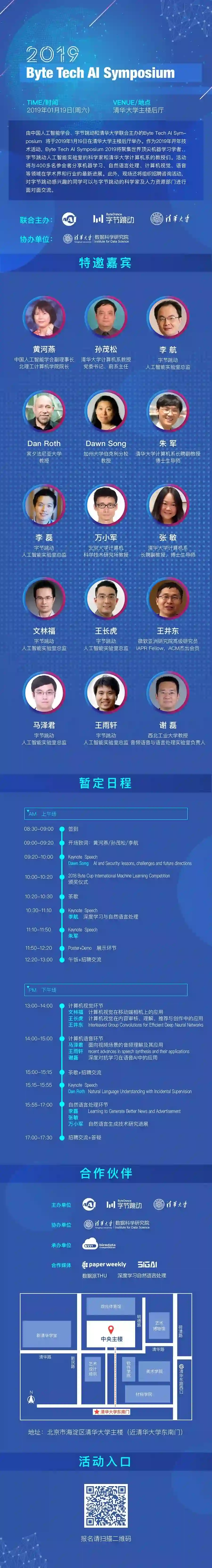 2019 年 1 月 19 日,字节跳动联合中国人工智能学会、清华大学,共同在清华大学主楼举办 Byte Tech AI Symposium 2019。字节跳动人工智能实验室的科学家将和来自国内外大学的学者一起,共同分享机器学习领域的前沿研究,这些技术在字节跳动产品中的应用。此外,现场还将组织招聘交流活动。