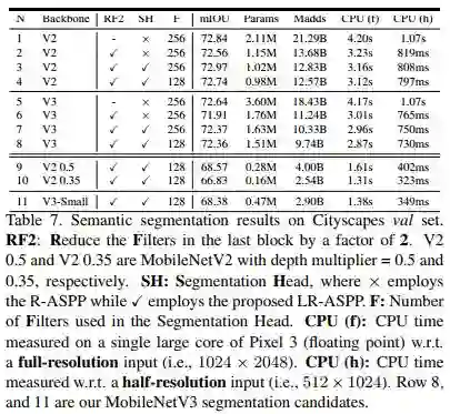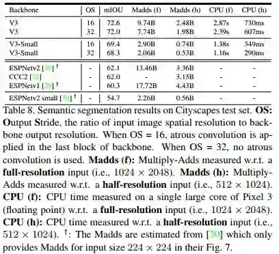 在Cityscapes语义分割任务中,新设计的模型MobileNetV3-Large LR-ASPP 与 MobileNetV2 R-ASPP分割精度近似,但快30%。