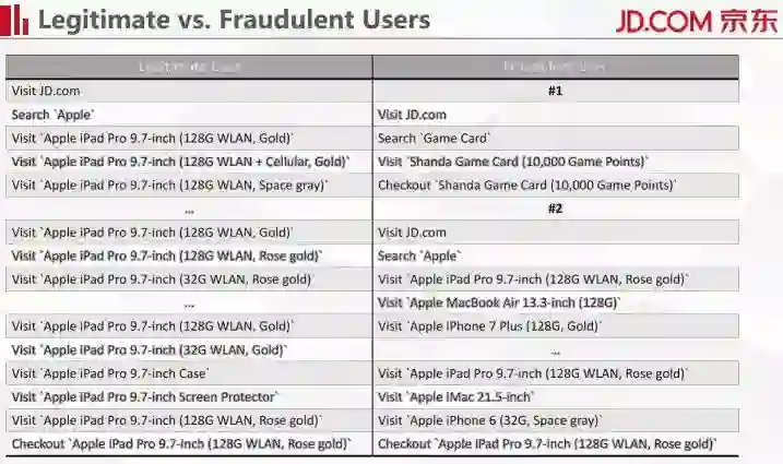 上面这个表左边展示的是正常用户的浏览路径,可以看到这个用户最后买了一个 128G 的 wifi 版玫瑰金 iPad Pro,整个浏览路径非常有规律。对于欺诈用户而言,看右边这两个用户,从统计上来说有两个比较鲜明的特点。