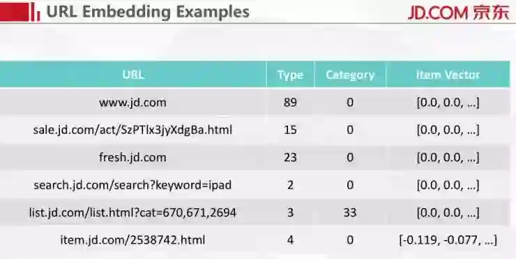 我们可以把 URL 的编码划分成三部分,第一部分是 URL 的类型,第二部分是 category,第三部分是 item Vector。我们把所有用户的点击行为做完了编码之后,每一次点击都可以得到一个编码后的向量,用户的整个浏览行为就可以看成一个向量的组合,最后我们再从数据表里面去找这个 session 是正常的还是被举报过的。