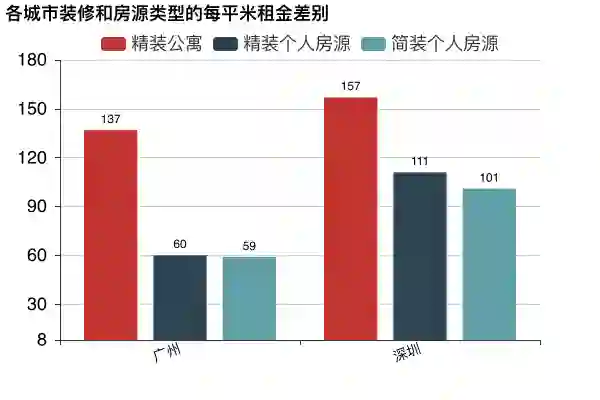可以看到,在广州和深圳,精装公寓都是要比个人房源贵上很多的。广州个人房源精装和简装租金几乎无差别,但精装公寓比精装个人房源每平米租金要贵上77元(一倍不止)!深圳要贵46元。也就是说,在广州租一个20平的房子,精装公寓要比个人房源贵上1540元!