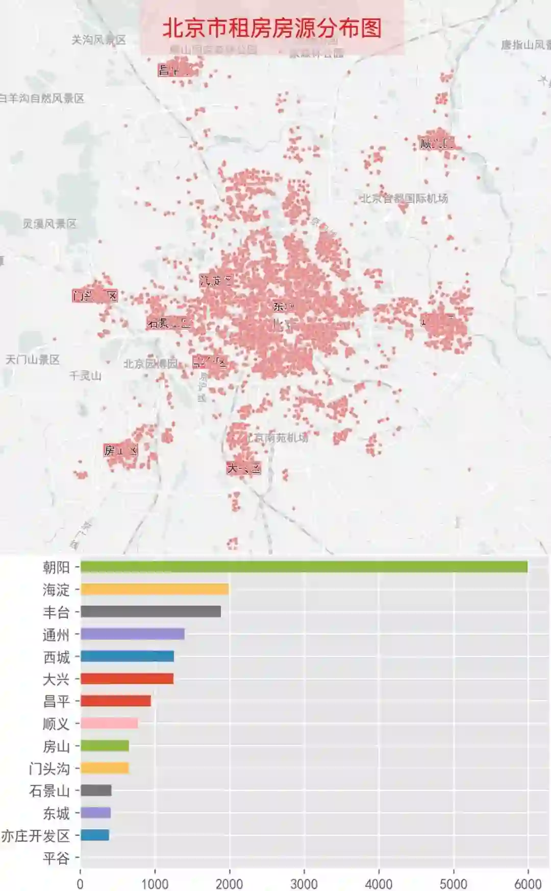 我们把北上广深四个城市的房源都以小点的形式投射在地图上,先来看看北京的。