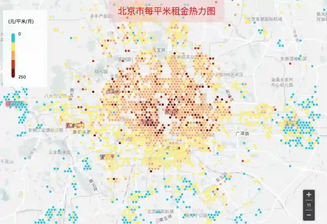 租房房源分布透露出来的信息其实不多,我们更关心的是各区域的价格。为此我们计算了各房源每平米每月的租金,并绘制了热力地图,先来看北京的。