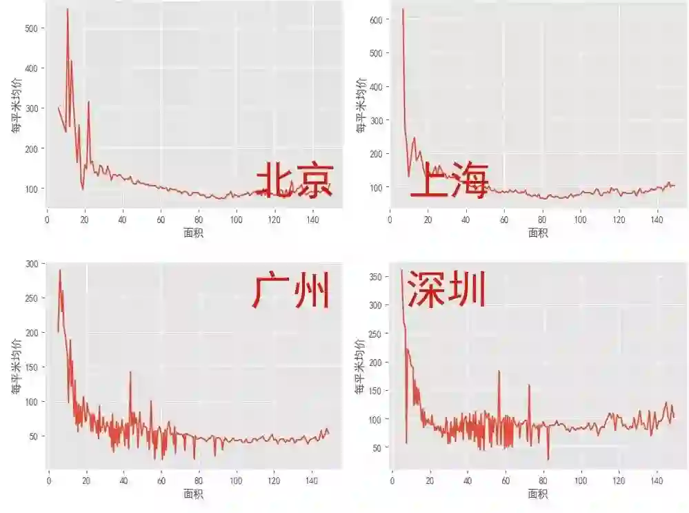 我们把各城市房源的面积和每平米均价绘制出关系图。可以看到,不管是哪个城市,出租面积在15平米以内的房子每平米租金都是最贵的,当然这里不排除租金贵的区域有更多单独出租的小房间这个原因。但是还是可以看出来,如果有认识的好友一起租大房子,不仅每平米的租金更便宜,而且还可以有一个大点的公用客厅。